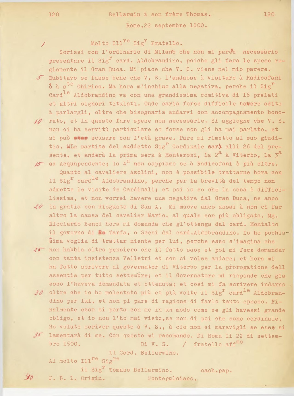 Dubitavo se fosse bene che V. S. l'andasse a visitare a Radicofani o a S.to Chirico. Ma ora m'inchino alla negativa, perché il Sig.r Card.le Aldobrandini va con una grandissima comitiva di 16 prelati et altri signori titolati. Onde sarà forse difficile avere adito a parlargli, oltre che bisognerà andarvi con accompagnamento onorato, et in questo fare spese non necessarie. Si aggiunge che V. S. non ci ha servitù particolare et forse non gli ha mai parlato, et si può scusare con l'età grave. Pure mi rimetto al suo giudizio. La partita del suddetto Sig.r Cardinale sarà alli 26 del presente, et andrà la prima sera a Monterosi, la 2a a Viterbo, la 3a ad Acquapendente; la 4a non sappiamo se a Radicofani o più oltre. Quanto al cavaliere Azzolini, non è possibile trattarne ora con il Sig.r card.le Aldobrandini, perché per la brevità del tempo non ammette le visite de Cardinali; et poi io so che la cosa è difficilissima, et non vorrei avere una negativa dal Gran Duca, ne anco la grazia con disgusto di Sua A. Mi muove anco assai a non ci far altro la causa del cavalier Mario, al quale son più obbligato. Mg. Ricciardo Benci ora mi domanda che gl'ottenga dal card. Montalto il governo di Farfa, o Scesi dal card. AldobrandinI. Io ho pochissima voglia di trattar niente per lui, perché esso s'immagina che non abbia altro pensiero che il fatto suo; et poi mi fece domandar con tanta insistenza Velletri et non ci volle andare; et ora mi ha fatto scrivere al governator di Viterbo per la prorogatione dell'assenza per tutto settembre; et il Governatore mi risponde che già esso l'aveva domandata et ottenuta; et così mi fa scrivere indarno oltre che io ho molestato più et più volte il Sig.r card.le Aldobrandini per lui, et non mi pare di ragione di farlo tanto spesso. Finalmente esso si porta con me in un modo come se gli avessi grande obbligo, et io non l'ho mai visto,se non di poi che sono cardinale. Ho voluto scriver questo a V. S., a ciò non si meravigli se esso si lamenterà di me. Con questo mi raccomando. Di Roma li 22 di settembre 1600.