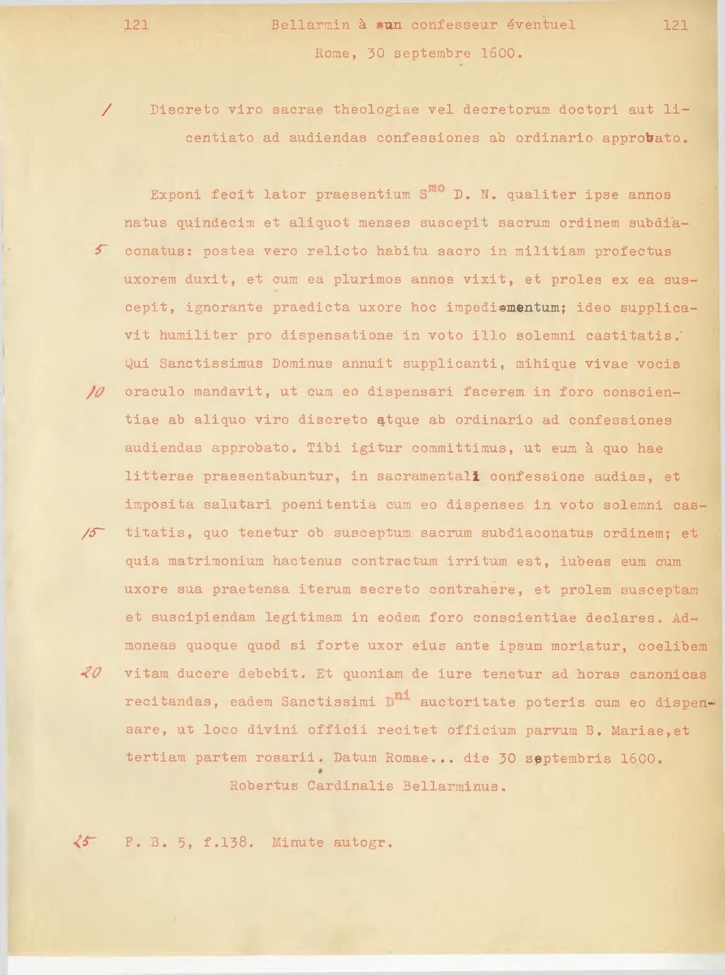 Exponi fecit lator praesentium S.mo D. N. qualiter ipse annos natus quindecim et aliquot menses suscepit sacrum ordinem subdiaconatus: postea vero relieto habitu sacro in militiam profectus uxorem duxit, et cum ea plurimos annos vixit, et proles ex ea suscepit, ignorante praedicta uxore hoc impedimentum; ideo supplicavit humiliter pro dispensatione in voto ilio solemni castitatis. Qui Sanctissimus Dominus annuii supplicanti, mihique vivae vocis oraculo mandavit, ut cum eo dispensari facerem in foro conscientiae ab aliquo viro discreto qtque ab ordinario ad confessiones audiendas approbato. Tibi igitur committimus, ut eum a quo hae litterae praesentabuntur, in sacramentali confessione audias, et imposita salutari poenitentia cum eo dispenses in voto solemni castitatis, quo tenetur ob susceptum sacrum subdiaconatus ordinem; et quia matrimonium hactenus contractum irritum est, iubeas eum cum uxore sua praetensa iterum secreto contrahere, et prolem susceptam et suscipiendam legitimam in eodem foro conscientiae declares. Admoneas quoque quod si forte uxor eius ante ipsum moriatur, coelibem vitam ducere debebit. Et quoniam de iure tenetur ad horas canonicas recitandas, eadem Sanctissimi auctoritate poterle cum eo dispensare, ut loco divini officii recitet officium parvum B. Mariae, et tertiam partem rosarii. Datum Romae... die 30 septembris 1600.