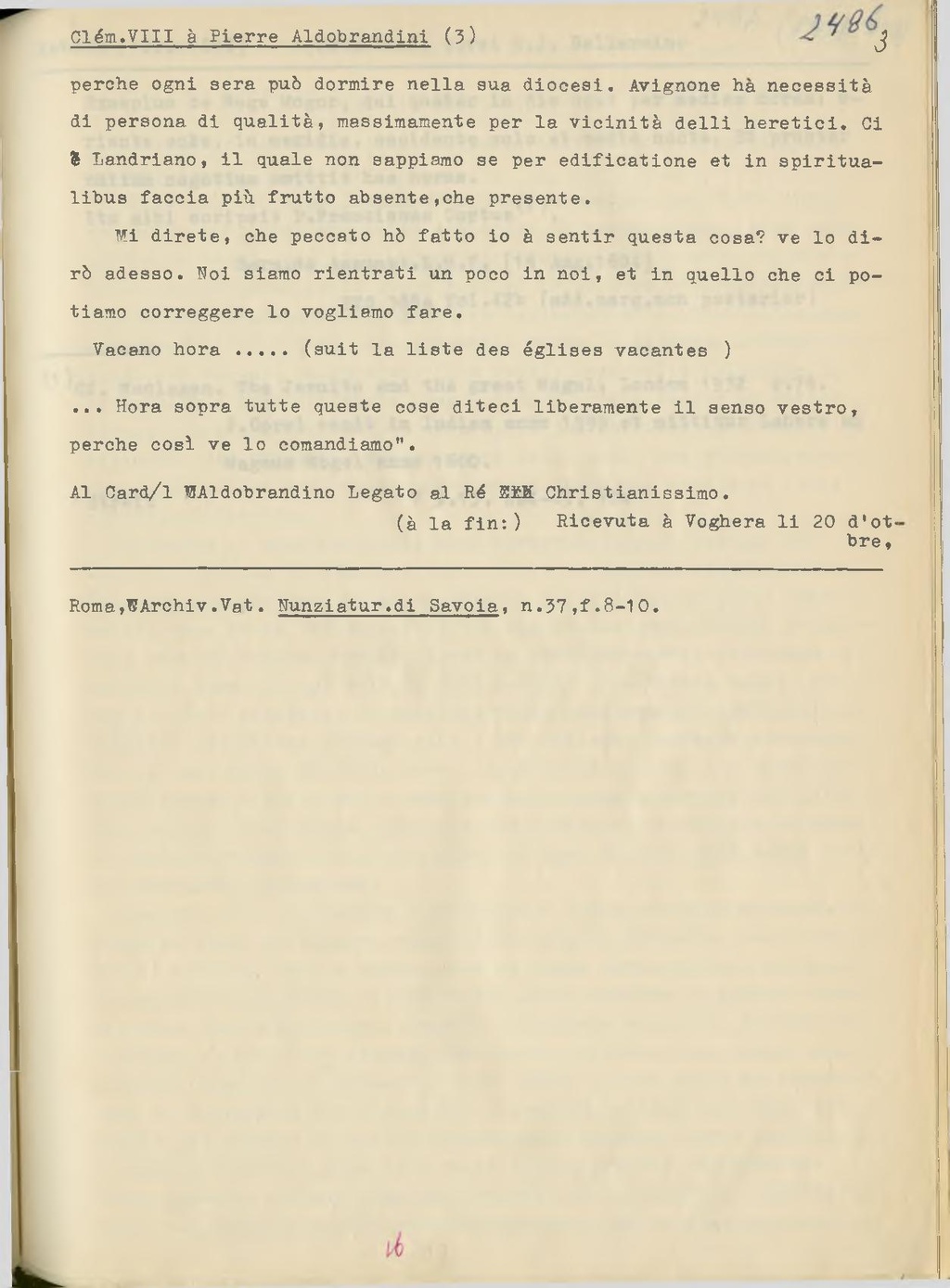 perche ogni sera puo dormire nella sua diocesi. Avignone ha necessità di persona di qualità, massimamente per la vicinità delli heretici. Ci è Landriano, il quale non sappiamo se per edificatione et in spiritualibus faccia più frutto absente, che presente.