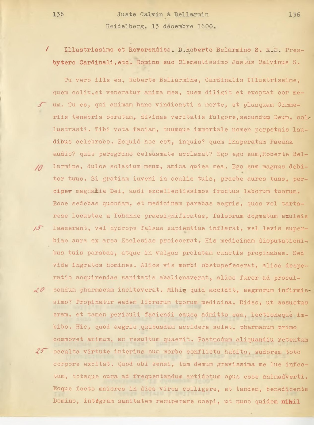 Illustrissimo et Reverendiss. D.Roberto Bellarmino S.R.E. Presbytero Cardinali, etc. Domino suo Clementissimo Justus Calvinus S.