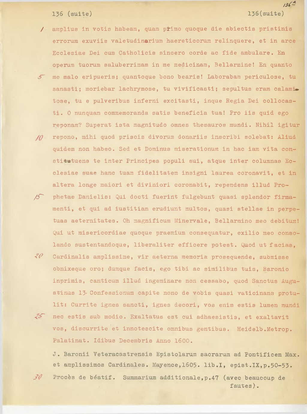 amplius in votis habeam, quam primo quoque die abiectis pristinis errorum exuviis valetudinarium haereticorum relinquere, et in arce Ecclesiae Dei cum Catholicis sincero corde ac fide ambulare. En operum tuorum saluberrimam in me medicinam, Bellarmine! En quanto me malo eripueris; quantoque bono bearis! Laborabam periculose, tu sanasti; moriebar lachrymose, tu vivificasti; sepultus eram calamitose, tu e pulveribus inferni excitasti, inque Regia Dei collocasti. O nunquam commemoranda satis beneficia tua! Pro iis quid ego reponam? Superai ista magnitudo omnes thesauros mundi. Nihil igitur repono, mihi quod priscis divorum donariis inscribi solebat: Aliud quidem non habeo. Sed et Dominus miserationum in hac iam vita constituens te inter Principes populi sui, atque inter columnas Ec clesiae suae hanc tuam fidelitatem insigni laurea coronavit, et in altera longe malori et diviniori coronabit, rependens illud Prophetae Danielis: Qui docti fuerint fulgebunt quasi splendor firma menti, et qui ad iustitiam erudiunt multos, quasi stellae in perpetuas aeternitates. Oh magnificum Minervale, Bellarmino meo debitum! Qui ut misericordiae quoque praemium consequatur, exilio meo conso lando sustentandoque, liberaliter efficere potest. Quod ut facias, Cardinalis amplissime, vir aeterna memoria prosequende, submisse obnixeque oro; dumque facis, ego tibi ac similibus tuis. Baronie inprimis, canticum illud ingeminare non cessabo, quod Sanctus Augustinus 13 Confessionum capite nono de vobis quasi vaticinane protulit: Currite ignes sancii, ignee decori, vos enim estis lumen mundi nec estis sub modio. Exaltatus est cui adhaesistis, et exaltavit vos, discurrite et innotescite omnibus gentibus. Heidelb.Metrop. Palatinat. Idibus Decembris Anno 1600.