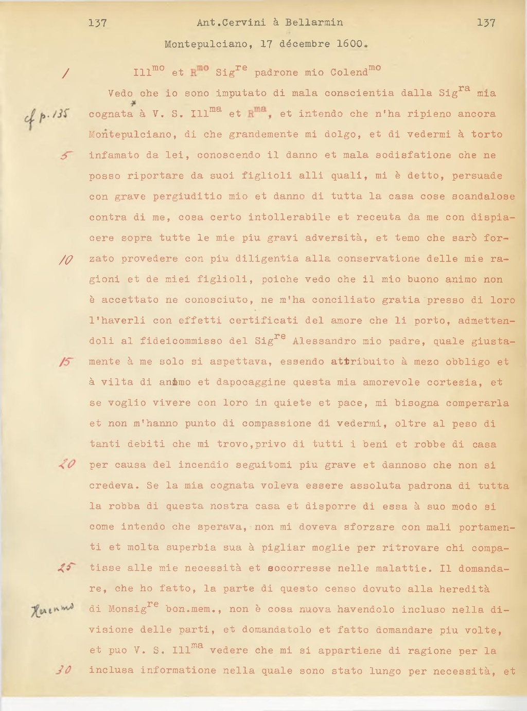 Vedo che io sono imputato di mala coscienza dalla Sig.ra mia cognata a V. S. Ill.ma e intendo che n'ha ripieno ancora Montepulciano, di che grandemente mi dolgo, e di vedermi a torto infamato da lei, conoscendo il danno e mala soddisfazione che ne posso riportare da suoi figlioli ai quali, mi è detto, persuade con grave pregiudizio mio e danno di tutta la casa cose scandalose contro di me, cosa certo intollerabile e ricevuta da me con dispiacere sopra tutte le mie più gravi avversità, e temo che sarà forzato provvedere con più diligenza alla conservazione delle mie ragioni e de miei figlioli, poichè vedo che il mio buono animo non è accettato ne conosciuto, ne m'ha conciliato grazia presso di loro l'averli con effetti certificati del amore che li porto, ammettendoli al fidei commisso del Sig.re Alessandro mio padre, quale giustamente a me solo si aspettava, essendo attribuito a mezzo obbligo e viltà di animo e dappocaggine questa mia amorevole cortesia, e se voglio vivere con loro in quiete e pace, mi bisogna comperarla e non mi hanno punto di compassione di vedermi, oltre al peso di tanti debiti che mi trovo,privo di tutti i beni e robe di casa per causa dell' incendio seguitomi più grave e dannoso che non si credeva. Se la mia cognata voleva essere assoluta padrona di tutta