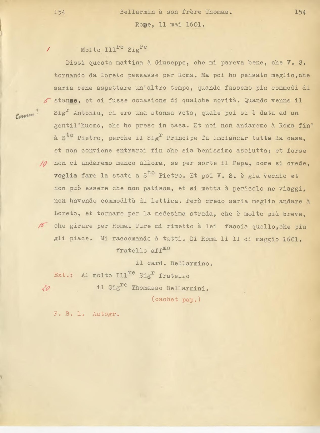 Dissi questa mattina a Giuseppe, che mi pareva bene, che V.S. tornando da Loreto passasse per Roma. Ma poi ho pensato meglio, che sarebbe bene aspettare un'altro tempo, quando fossimo più comodi di stanze, e ci fosse occasione di qualche novità. Quando venne il Sig.r Antonio, ci era una stanza vota, quale poi si è data ad un gentiluomo, che ho preso in casa. E noi non andremo a Roma fino S.to Pietro, perchè il Sig.r Principe fa imbiancar tutta la casa, e non conviene entrarci fin che sia benissimo asciutta; e forse non ci andremo manco allora, se per sorte il Papa, come si crede, voglia fare la state a S.to Pietro. E poi V.S. è già vecchio e non può essere che non patisca, e si metta a pericolo ne viaggi, non avendo comodità di lattica. Però credo sarebbe meglio andare a Loreto, e tornare per la medesima strada, che è molto più breve, che girare per Roma. Pure mi rimetto a lei faccia quello, che più gli piace. Mi raccomando a tutti. Di Roma li 11 di maggio 1601.