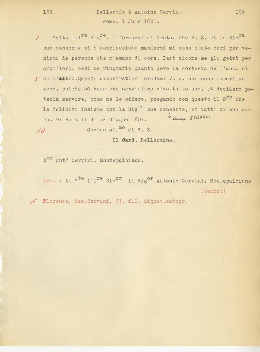 Molto Ill.re Sig.re. I formaggi di Creta[1], che V. S. e la Sig.ra sua consorte si è compiaciuta mandarmi mi sono stato cari per venirmi da persone che m'amano di cuore. Però siccome me gli godrò per amor loro, così ne ringrazio quanto devo la cortesia dell'uno, e dell'altro. Queste dimostrazioni mi creda V.S. che sono superflue con me, poichè sebbene che senz'altro vivo tutto suo, e desidero poterla servire, come me le offro, pregando con questo il S.re che la feliciti insieme con la Sig.ra sua consorte, e tutti di sua casa. Di Roma il di p° Giugno 1601.