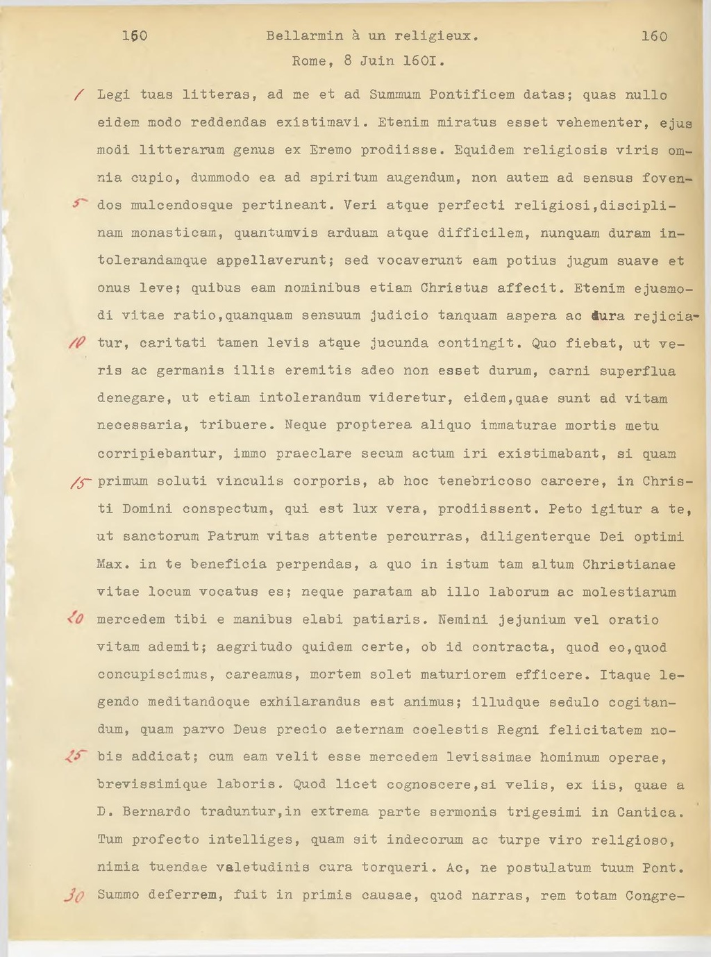 Legi tuas litteras, ad me et ad Summum Pontificem datas; quas nullo eidem modo reddendas existimavi. Etenim miratus esset vehementer, ejus modi litterarum genus ex Eremo prodiisse. Equidem religiosis viris om nia cupio, dummodo ea ad spiritum augendum, non autem ad sensus fovendos mulcendosque pertineant. Veri atque perfecti religiosi, disciplinam monasticam, quantumvis arduam atque difficilem, nunquam duram intolerandamque appellaverunt; sed vocaverunt eam potius jugum suave et onus leve; quibus eam nominibus etiam Christus affecit. Etenim ejusmodi vitae ratio, quanquam sensuum judicio tanquam aspera ac Aura rejiciatur, caritati tamen levis atque jucunda contingit. Quo fiebat, ut veris ac germanio illis eremitis adeo non esset durum, carni superflua denegare, ut etiam intolerandum videretur, eidem,quae sunt ad vitam necessaria, tribuere. Neque propterea aliquo immaturae mortis metu corripiebantur, immo praeclare secum actum iri existimabant, si quam primum soluti vinculis corporis, ab hoc tenebricoso carcere, in Christi Domini conspectum, qui est lux vera, prodiissent. Peto igitur a te, ut sanctorum Patrum vitas attente percurras, diligenterque Dei optimi Max. in te beneficia perpendas, a quo in istum tam altum Christianae vitae locum vocatus es; neque paratam ab ilio laborum ac molestiarum mercedem tibi e manibus elabi patiaris. Nemini jejunium vel oratio vitam ademit; aegritudo quidem certe, ob id contrasta, quod eo, quod concupiscimus, careamus, mortem solet maturiorem efficere. Itaque legendo meditandoque exhilarandus est animus; illudque sedulo cogitandum, quam parvo Deus precio aeternam coelestis Regni felicitatem nobis addicat; cum eam velit esse mercedem levissimae hominum operae, brevissimique laboris. Quod licet cognoscere, si velis, ex iis, quae a D. Bernardo traduntur, in extrema parte sermonis trigesimi in Cantica. Tum profecto intelliges, quam sit indecorum ac turpe viro religioso, nimia tuendae valetudinis cura torqueri. Ac, ne postulatum tuum Pont. Summo deferrem, fuit in primis causae, quod narras, rem totam Congregationis