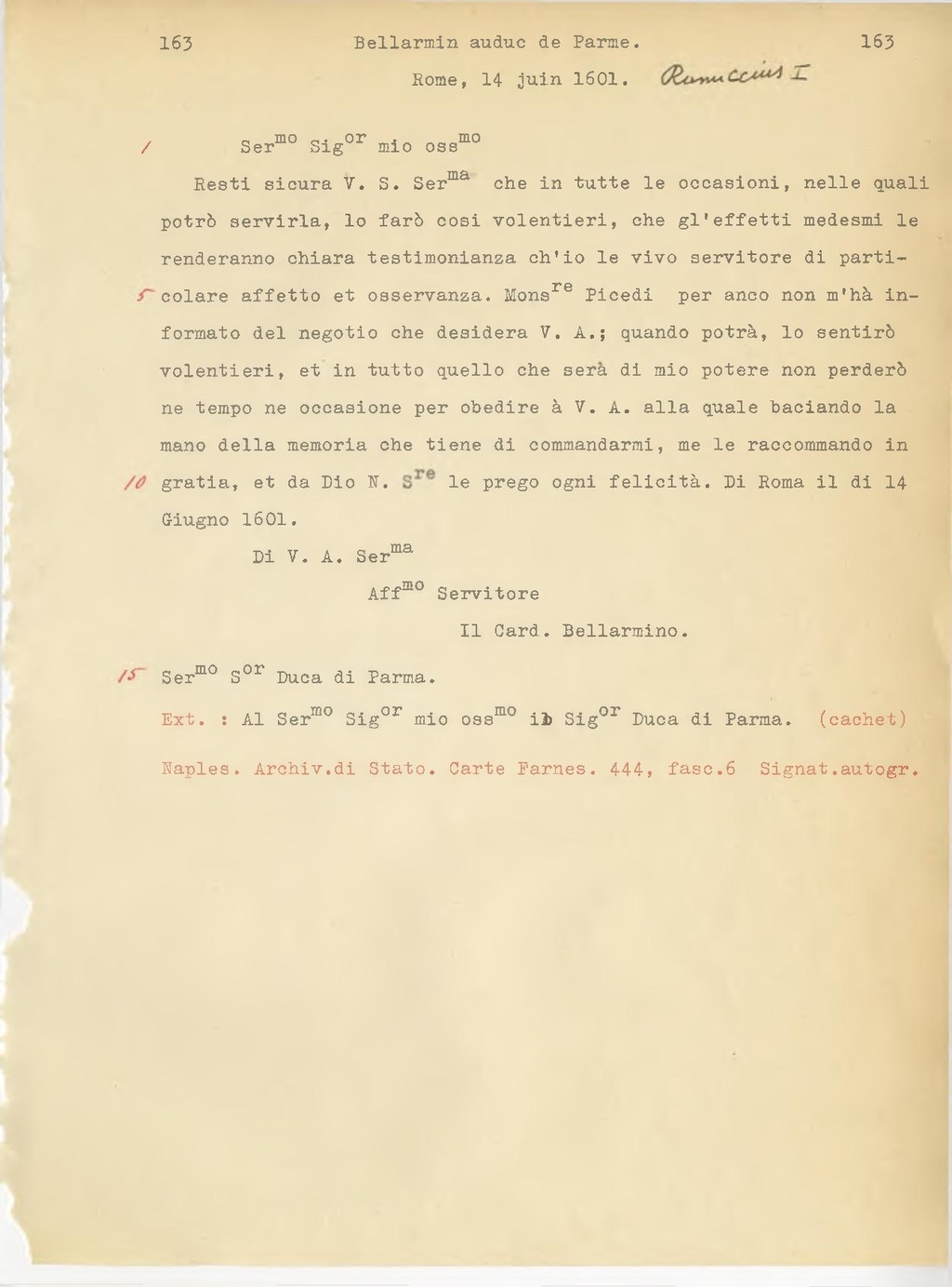 Ser.mo S.or Duca di Parma.