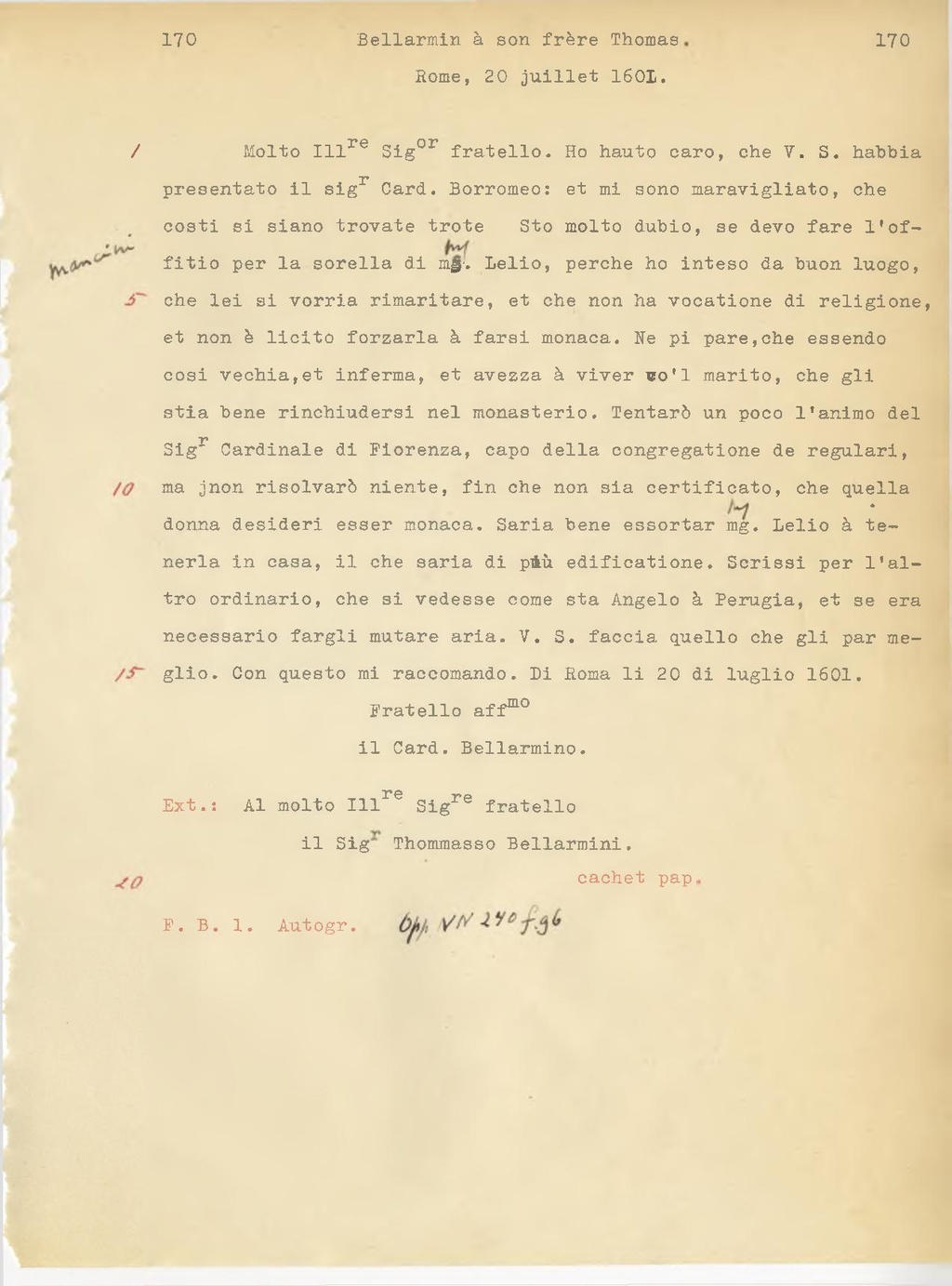 Molto Ill.re Sig.or fratello. Ho avuto caro, che V.S. abbia presentato il sig.r Card. Borromeo: e mi sono meravigliato, che costì si siano trovate trote Sto molto dubbio, se devo fare l'officio per la sorella di ms. Lelio, perchè ho inteso da buon luogo, che lei si vorrebbe rimaritare, e che non ha vocazione di religione, e non è licito forzarla a farsi monaca. Ne pi pare, che essendo cosi vecchia, e inferma, e avvezza a viver col marito, che gli stia bene rinchiudersi nel monastero. Tenterò un poco l'animo del Sig.r Cardinale di Fiorenza, capo della congregazione dei regolari, ma non risolverà niente, fin che non sia certificato, che quella donna desideri esser monaca. Sarebbe bene esortar mg. Lelio a tenerla in casa, il che sarebbe di più edificazione. Scrissi per l'altro ordinario, che si vedesse come sta Angelo a Perugia, e se era necessario fargli mutare aria. V.S. faccia quello che gli par meglio. Con questo mi raccomando. Di Roma li 20 di luglio 1601.