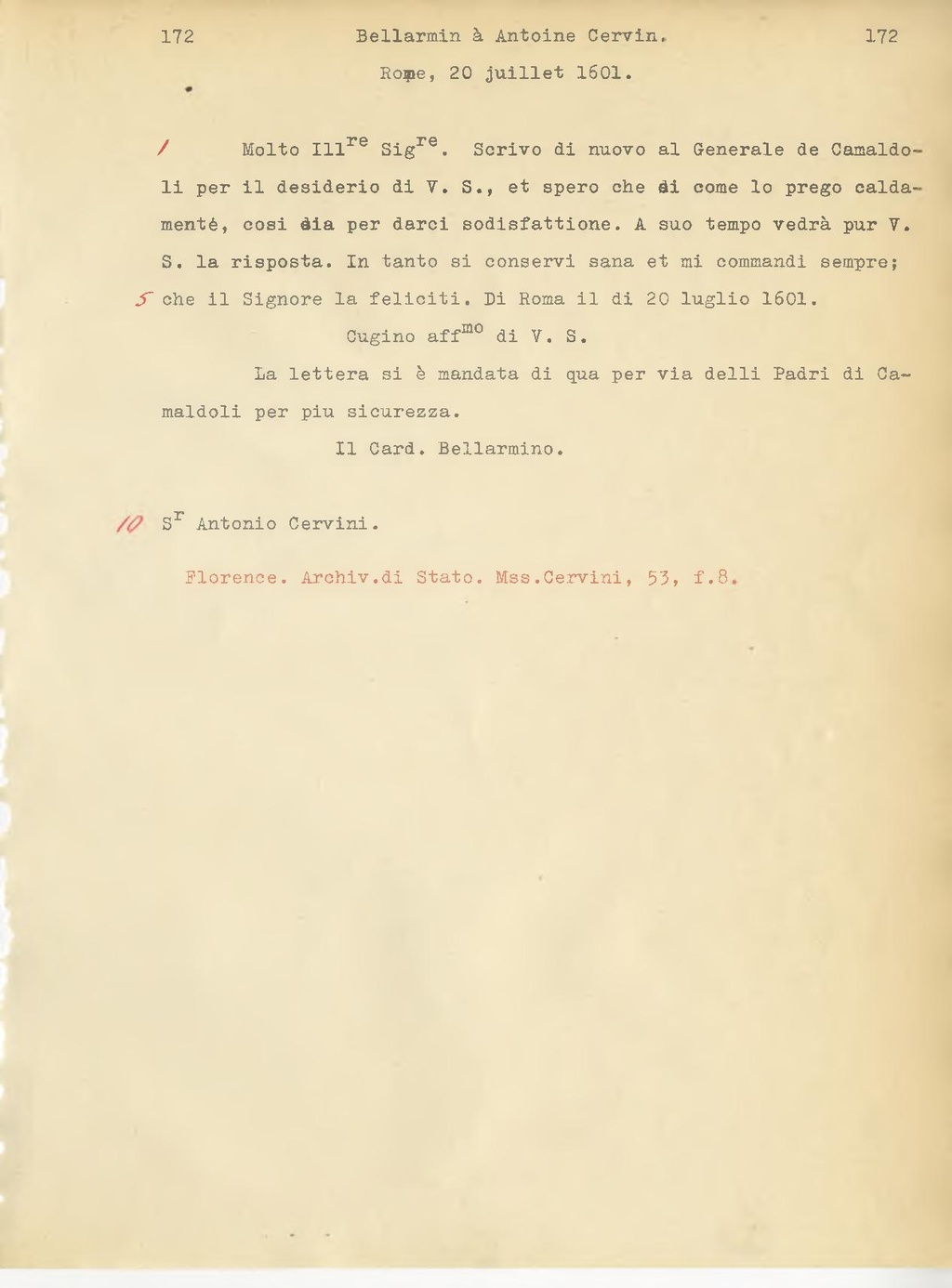 Molto Ill.re Sig.re. Scrivo di nuovo al Generale de Camaldoli per il desiderio di V.S., e spero che di come lo prego caldamente, così dia per darci soddisfazione. A suo tempo vedrà pur V.S. la risposta. In tanto si conservi sana e mi comandi sempre; che il Signore la feliciti. Di Roma il di 20 luglio 1601.