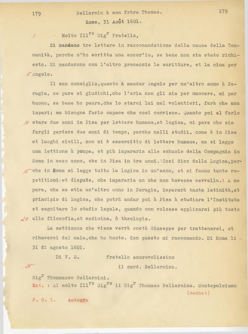 Ext.: Al molto Ill.re Sig.re il Sig.r Thomaso Bellarmino. Montepulciano