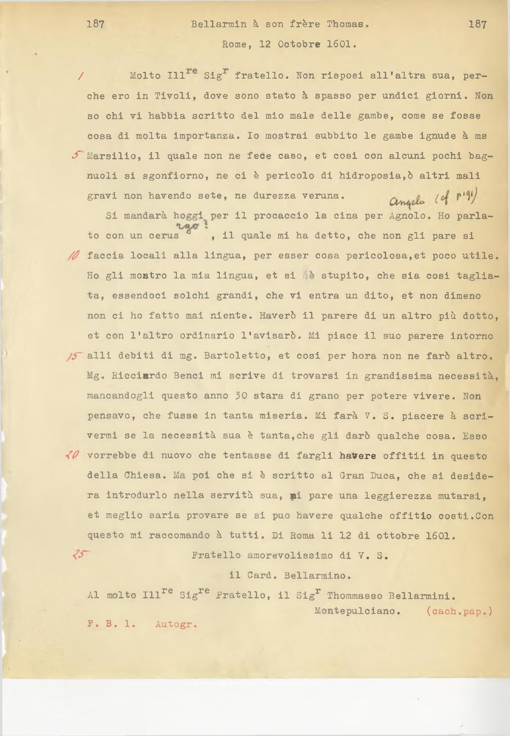 Al molto Ill.re Sig.re Fratello, il Sig.r Tommaso Bellarmini. Montepulciano.