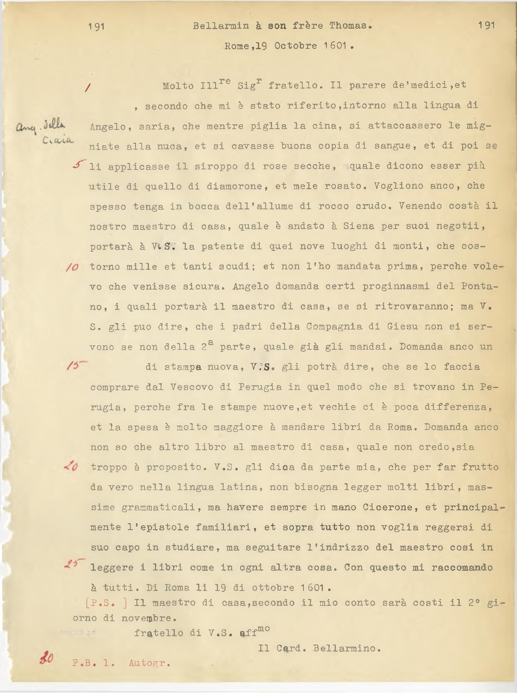 Molto Ill.re Sig.r fratello. Il parere dei medici, e, secondo che mi è stato riferito, intorno alla lingua di Angelo, sarebbe, che mentre piglia la cina[1], si attaccassero le mignatte[2] alla nuca, e si cavasse buona copia di sangue, e di poi si applicasse lo sciroppo di rose secche, quale dicono esser più utile di quello di diamorone, e mele rosato. Vogliono anche, che spesso tenga in bocca dell'allume di rocco crudo[3]. Venendo costì il nostro maestro di casa, quale è andato a Siena per suoi negozi, porterà a V.S. la patente di quei nove luoghi di monti, che costarono mille e tanti scudi; e non l'ho mandata prima, perchè volevo che venisse sicura. Angelo domanda certi proginnasmi del Pontano, i quali porterà il maestro di casa, se si ritroveranno; ma V.S. gli può dire, che i padri della Compagnia di Gesù non si servono se non della 2°parte, quale già gli mandai. Domanda anche uno di stampa nuova, V.S. gli potrà dire, che se lo faccia comprare dal Vescovo di Perugia in quel modo che si trovano in Perugia, perchè fra le stampe nuove, e vecchie ci è poca differenza, e la spesa è molto maggiore a mandare libri da Roma. Domanda anche non so che altro libro al maestro di casa, quale non credo, sia troppo a proposito. V.S. gli dica da parte mia, che per far frutto da vero nella lingua latina, non bisogna legger molti libri, massime grammaticali, ma avere sempre in mano Cicerone, e principalmente le epistole familiari, e sopra tutto non voglia reggersi di suo capo in studiare, ma seguitare l'indirizzo del maestro cosi in leggere i libri come in ogni altra cosa. Con questo mi raccomando a tutti. Di Roma li 19 di ottobre 1601.