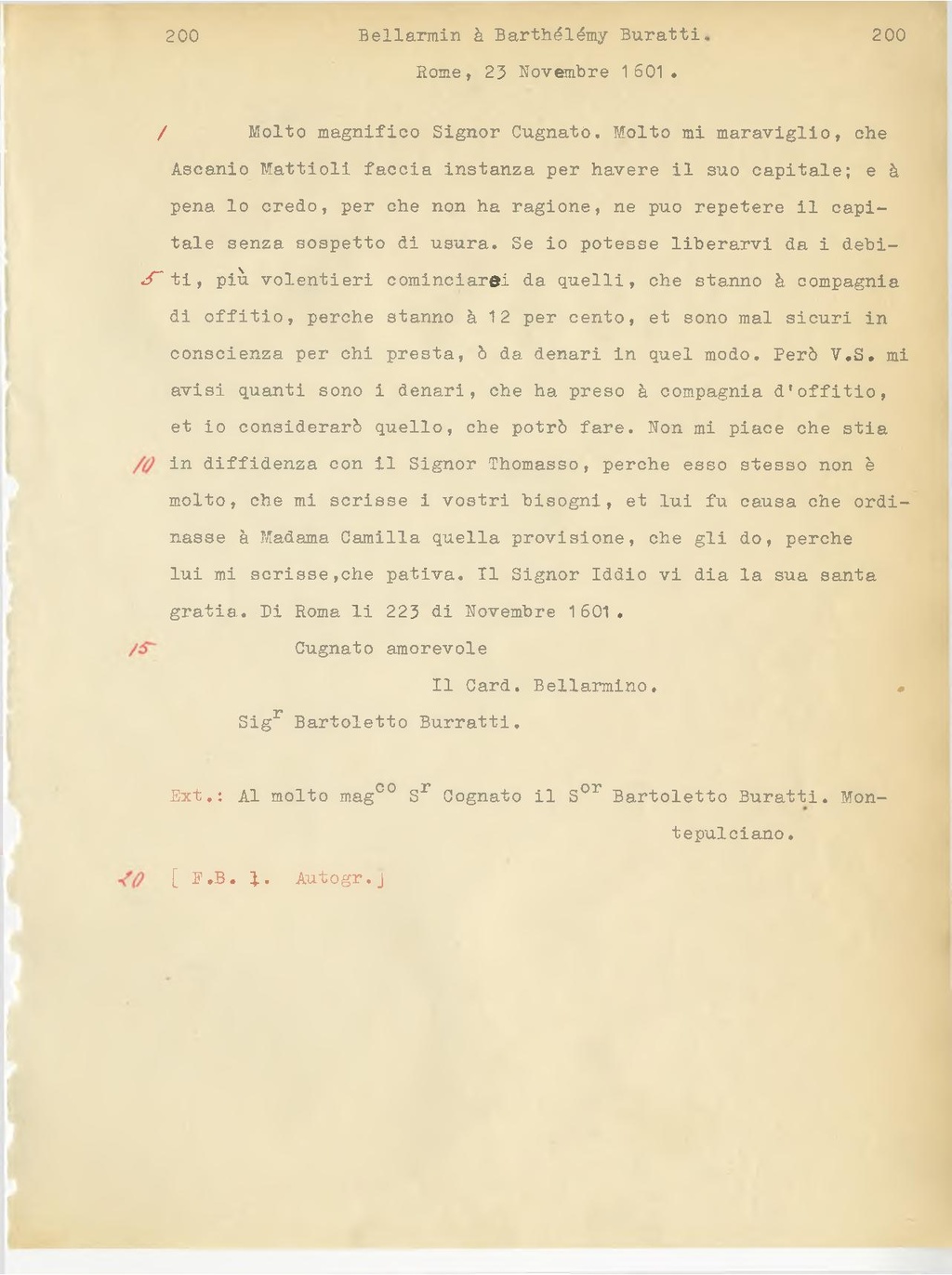Molto magnifico Signor Cognato. Molto mi meraviglio, che Ascanio Mattioli faccia istanza per avere il suo capitale; e appena lo credo, per che non ha ragione, ne può ripetere il capitale senza sospetto di usura. Se io potesse liberarvi da i debiti, più volentieri comincerei da quelli, che stanno a compagnia di officio, perchè stanno a 12 per cento, e sono mal sicuri in coscienza per chi presta, o da denari in quel modo. Però V.S. mi avvisi quanti sono i denari, che ha preso a compagnia d'officio, e io considererei quello, che potrò fare. Non mi piace che stia in diffidenza con il Signor Thomasso, perchè esso stesso non è molto, che mi scrisse i vostri bisogni, e lui fu causa che ordinasse a Madama Camilla quella provvigione, che gli do, perchè lui mi scrisse, che pativa. Il Signor Iddio vi dia la sua santa grazia. Di Roma li 223 di Novembre 1601.