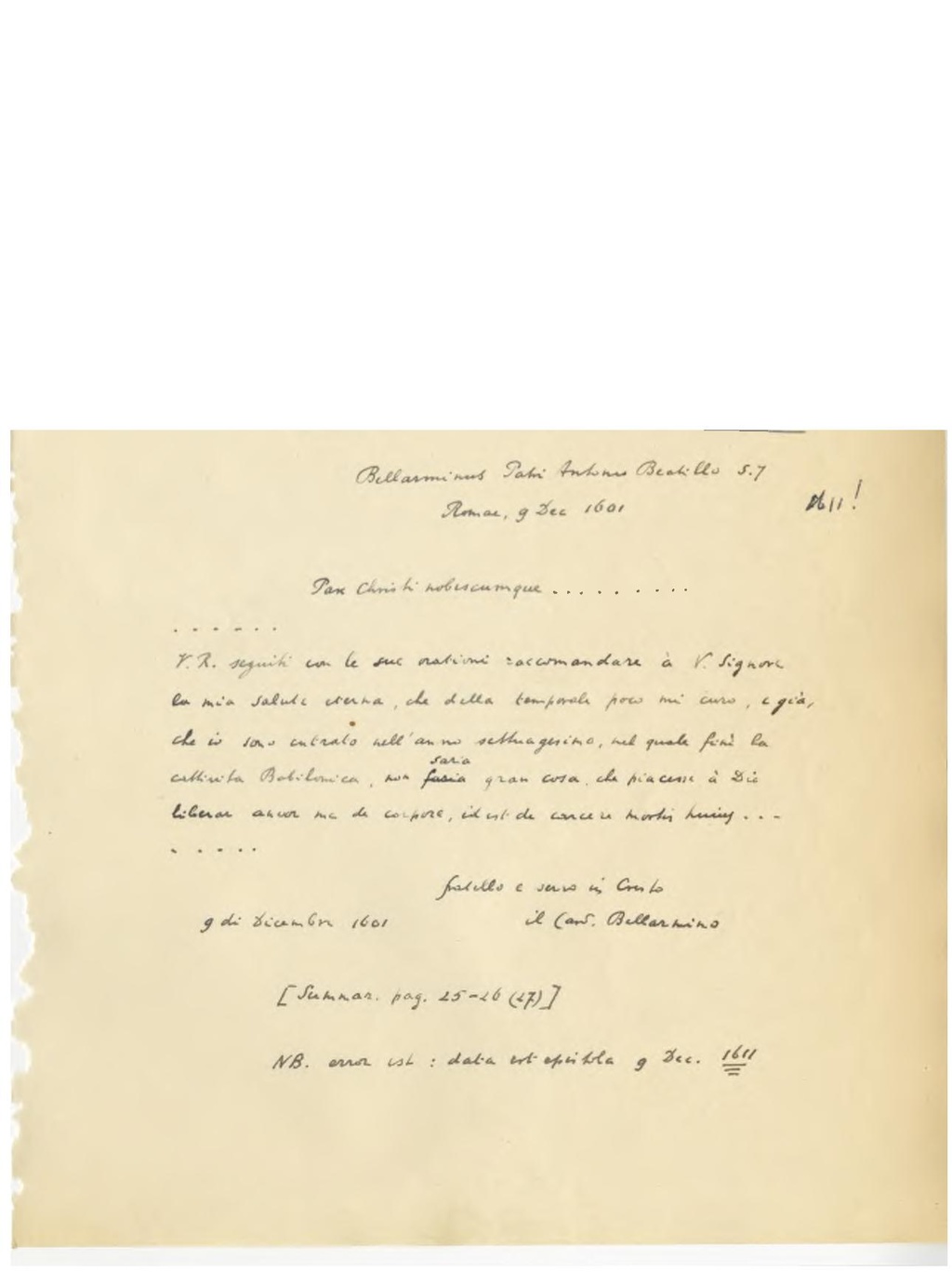 V.R. seguiti con le sue orazioni raccomandare a V. Signore la mia salute eterna, che della temporale poco mi curo, e già, che io sono entrato nell'anno settuagesimo, nel quale finì la cattività babilonese, non saria gran cosa che piacesse a Dio liberar ancor hic de corpore, id est de carcere hostis huius...