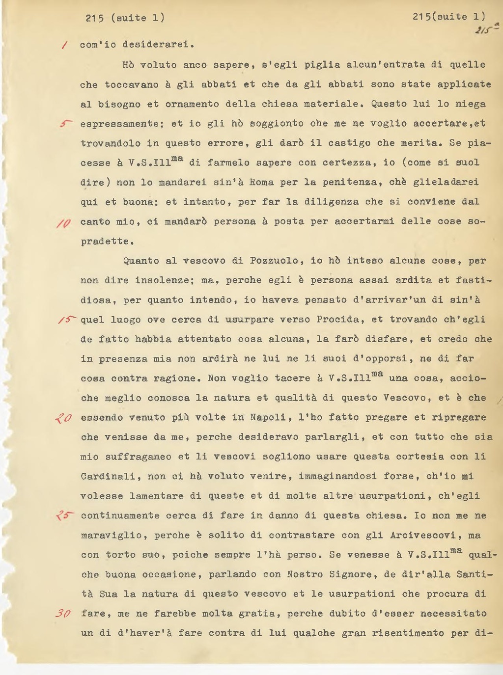 Quanto al vescovo di Fozzuolo, io ho inteso alcune cose, per non dire insolenze; ma, perchè egli è persona assai ardita e fastidiosa, per quanto intendo, io avevo pensato di arrivare un di sino a quel luogo ove cerca di usurpare verso Procida, e trovando ch'egli de fatto abbia attentato cosa alcuna, la farò disfare, e credo che in presenza mia non ardirà ne lui ne i suoi d'opporsi, ne di far cosa centra ragione. Non voglio tacere a V.S. Ill.ma una cosa, acciocchè meglio conosca la natura e qualità di questo Vescovo, e è che essendo venuto più volte in Napoli, l'ho fatto pregare et ripregare che venisse da me, perchè desideravo parlargli, e con tutto che sia mio suffraganeo e i vescovi sogliono usare questa cortesia con i Cardinali, non ci ho voluto venire, immaginandosi forse, ch'io mi volesse lamentare di queste e di molte altre usurpazioni, ch'egli continuamente cerca di fare in danno di questa chiesa. Io non me ne meraviglio, perchè è solito di contrastare con gli Arcivescovi, ma con torto suo, poichè sempre l'ha perso. Se venisse a V.S. Ill.ma qualche buona occasione, parlando con Nostro Signore, di dir alla Santità Sua la natura di questo vescovo e le usurpazioni che procura di fare, me ne farebbe molta grazia, perchè dubito d'esser necessitato un di di aver a fare contro di lui qualche gran risentimento per difendere
