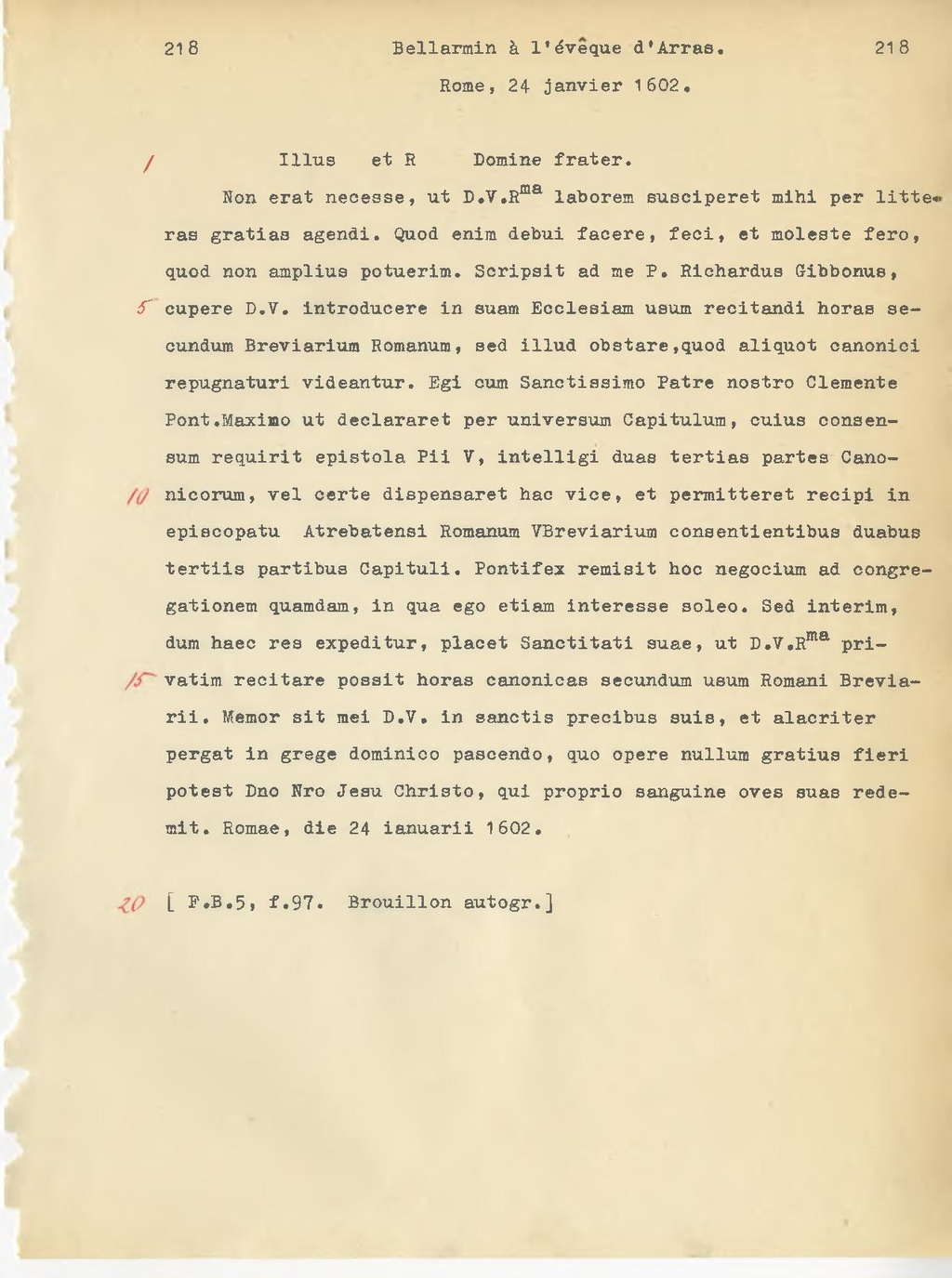Non erat necesse, ut D.V. R.ma laborem susciperet mihi per litteras gratias agendi. Quod enim debui facere, feci, et moleste fero, quod non amplius potuerim. Scripsit ad me P. Richardus Gibbonus, cupere D.V. introducere in suam Ecclesiam usum recitandi horas secundum Breviarium Romanum, sed illud obstare,quod aliquot canonici repugnaturi videantur. Egi oum Sanctissimo Patre nostro Clemente Pont. Maximo ut declararet per universum Capituium, cuius consensum requirit epistola Pii V, intelligi duas tertias partes Canonicorum, vel certe dispensaret hac vice, et permitteret recipi in episcopatu Atrebatensi Romanum Breviarium consentientibus duabus tertiis partibus Capitali. Pontifex remisit hoc negocium ad congregationem quamdam, in qua ego etiam interesse soleo. Sed interim, dum haec res expeditur, placet Sanctitati auae, ut D.V. R.ma privatim recitare possit horas canonicas secundum usum Romani Breviarii. Memor sit mei D.V. in sanctis precibus suis, et alacriter pergat in grege dominion pascendo, quo opere nullum gratius fieri potest D.no N.ro Jesu Christo, qui proprio sanguine oves suas redemit. Romae, die 24 ianuarii 1602.