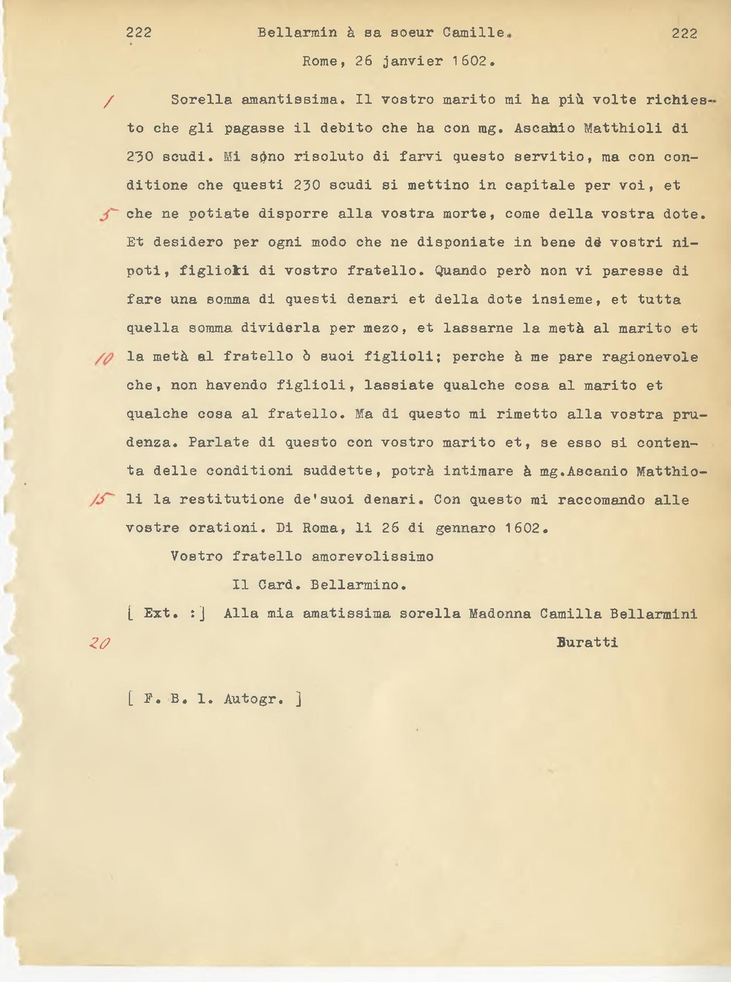 Sorella amatissima. Il vostro marito mi ha più volte richiesto che gli pagasse il debito che ha con mg. Ascanio Mattioli di 230 scudi. Mi sono risoluto di farvi questo servizio, ma con condizione che questi 230 scudi si mettano in capitale per voi, e che ne possiate disporre alla vostra morte, come della vostra dote. E desidero per ogni modo che ne disponiate in bene dei vostri nipoti, figlioli di vostro fratello. Quando però non vi paresse di fare una somma di questi denari e della dote insieme, e tutta quella somma dividerla per mezzo, e lasciarne la metà al marito e la metà al fratello o suoi figlioli; perchè a me pare ragionevole che, non avendo figlioli, lasciate qualche cosa al marito e qualche cosa al fratello. Ma di questo mi rimetto alla vostra prudenza. Parlate di questo con vostro marito et, se esso si contenta delle condizioni suddette, potrà intimare a mg.Ascanio Mattiioli la restituzione dei suoi denari. Con questo mi raccomando alle vostre orazioni. Di Roma, li 26 di gennaio 1602.
