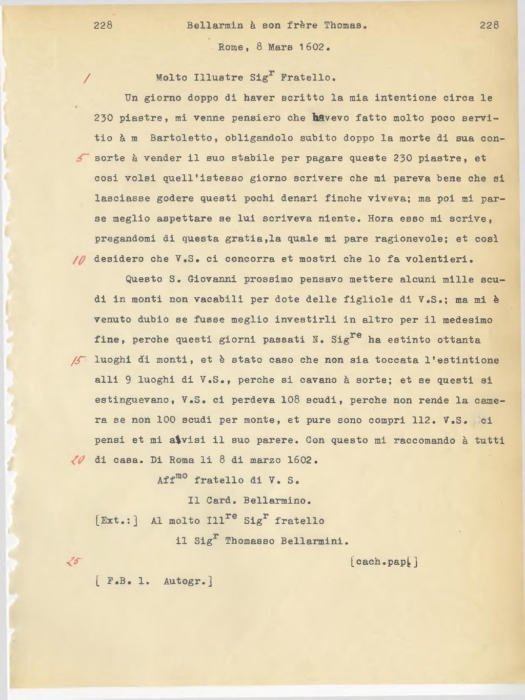 Questo S. Giovanni prossimo pensavo mettere alcuni mille scu di in monti non vacabili per dote delle figliole di V.S.; ma mi è venuto dubbio se fosse meglio investirli in altro per il medesimo fine, perchè questi giorni passati N. Sig.re ha estinto ottanta luoghi di monti, e è stato caso che non sia toccata l'estinzione ai 9 luoghi di V.S., perchè si cavano a sorte; e se questi si estinguevano, V.S. ci perdeva 108 scudi, perchè non rende la camera se non 100 scudi per monte, e pure sono compri 112. V.S. ci pensi e mi avvisi il suo parere. Con questo mi raccomando a tutti di casa. Di Roma li 8 di marzo 1602.