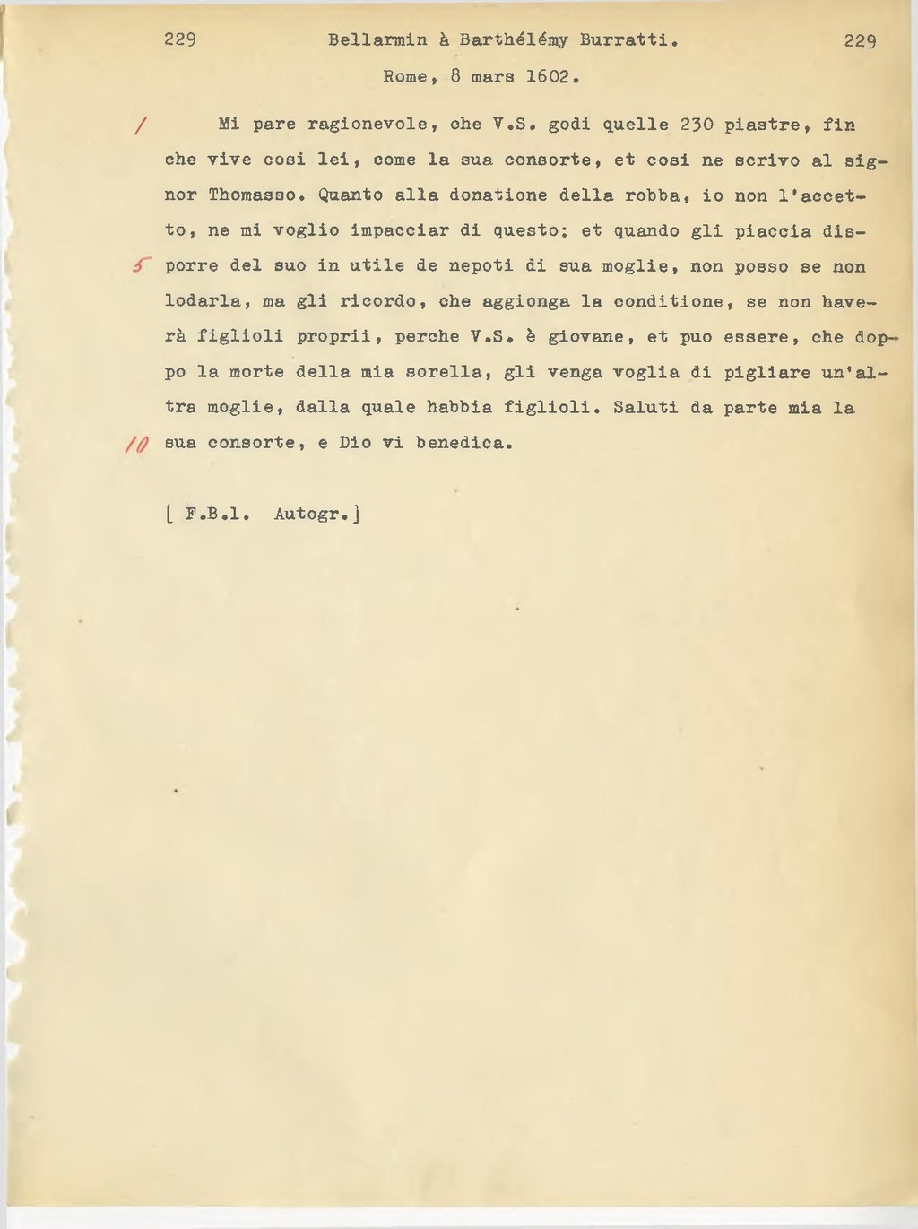 Mi pare ragionevole, che V.S. godi quelle 230 piastre, finchè vive cosi lei, come la sua consorte, et cosi ne scrivo al signor Tommaso. Quanto alla donazione della roba, io non l'accetto, ne mi voglio impacciar di questo; e quando gli piaccia disporre del suo in utile dei nipoti di sua moglie, non posso se non lodarla, ma gli ricordo, che aggiunga la condizione, se non avere figlioli propri, perchè V.S. è giovane, e può essere, che dopo la morte della mia sorella, gli venga voglia di pigliare un'altra moglie, dalla quale abbia figlioli. Saluti da parte mia la sua consorte, e Dio vi benedica.