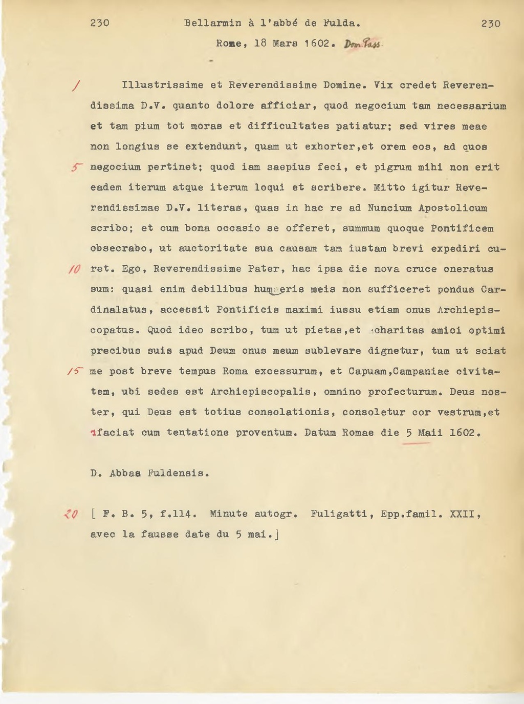 llustrissime et Reverendissime Domine. Vix credet Reverendissima D.V. quanto dolore afficiar, quod negocium tam necessarium et tam pium tot moras et difficultates patiatur[1]; sed vires meae non longius se extendunt, quam ut exhorter, et orem eos, ad quos negocium pertinet; quod iam saepius feci, et pigrum mihi non erit eadem iterum atque iterum loqui et scribere. Mitto igitur Reverendissimae D.V. literas, quas in hac re ad Nuncium Apostolicum[2]scribo; et cum bona ocoasio se offeret, summum quoque Pontificem obsecrabo, ut auctoritate sua causam tam iustam brevi expediri curet. Ego, Reverendissime Pater, hac ipsa die nova cruce oneratus sum: quasi enim debilibus humeris meis non sufficeret pondus Cardinalatus, accessit Pontificie maximi iussu etiam onus Archiepiscopatus. Quod ideo scribo, tum ut pietas, et charitas amici optimi precibus suis apud Deum onus meum sublevare dignetur, tum ut sciat me post breve tempus Roma excessurum, et Capuam, Campaniae civitatem, ubi sedes est Archiepiscopalis, omnino profecturum.[3] Deus noster, qui Deus est totius consolationis, consoletur cor vestrum, et faciat cum tentatione proventum. Datum Romae die 5 Maii 1602.