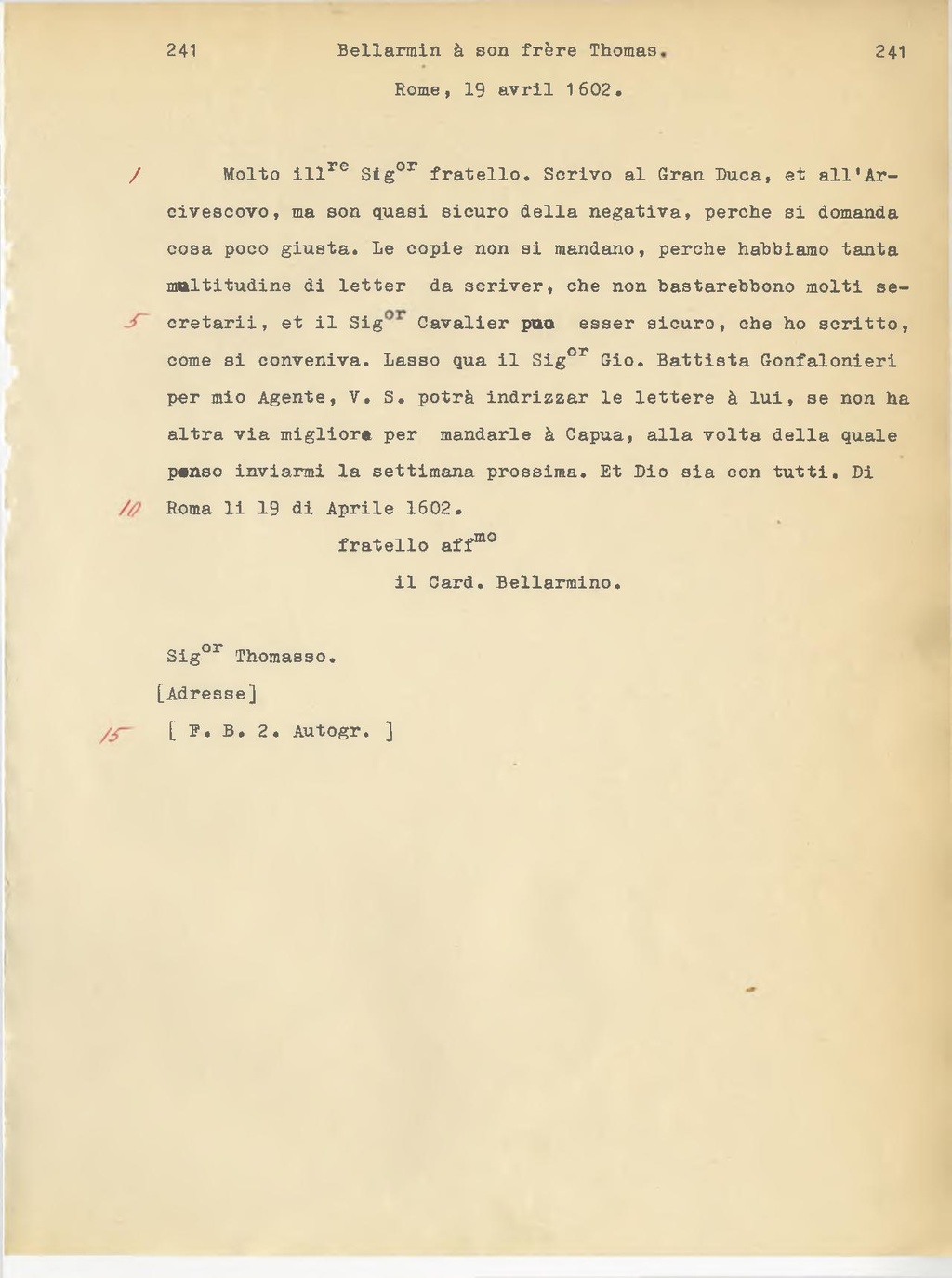 Molto ill.re Sig.or fratello. Scrivo al Gran Duca, e all'Arcivescovo, ma son quasi sicuro della negativa, perche si domanda cosa poco giusta. Le copie non si mandano, perche abbiamo tanta moltitudine di lettere da scriver, che non basterebbero molti segretari, e il Sig. Cavalier può esser sicuro, che ho scritto, come si conveniva. Lasso qua il Sig.or Gio. Battista Gonfalonieri per mio Agente, V.S. potrà indirizzare le lettere a lui, se non ha altra via migliora per mandarle a Capua, alla volta della quale penso inviarmi la settimana prossima. E Dio sia con tutti. Di Roma li 19 di Aprile 1602.