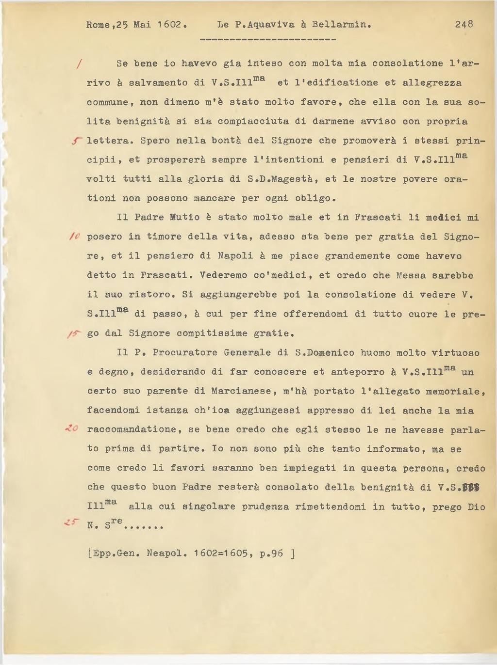 Il Padre Mutio è stato molto male e in Frascati li medici mi posero in timore della vita, adesso sta bene per grazia del Signore, e il pensiero di Napoli a me piace grandemente come avevo detto in Frascati. Vederemo coi medici, e credo che Messa sarebbe il suo ristoro. Si aggiungerebbe poi la consolazione di vedere V.S. Ill.ma di passo, a cui per fine offrendomi di tutto cuore le prego dal Signore compitissime grazie.