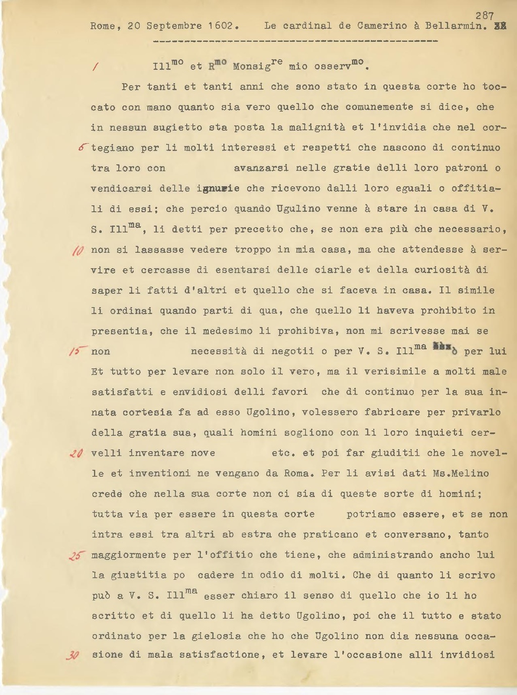 Per tanti e tanti anni che sono stato in questa corte ho toccato con mano quanto sia vero quello che comunemente si dice, che in nessun soggetto sta posta la malignità e l'invidia che nel cortigiano per i molti interessi e rispetti che nascono di continuo tra loro con avanzarsi nelle grazie dei loro patroni o vendicarsi delle ingiurie che ricevono dai loro eguali o officiali di essi; che perciò quando Ugulino venne a stare in casa di V.S. Ill.ma li detti per precetto che, se non era più che necessario, non si lasciasse vedere troppo in mia casa, ma che attendesse a servire e cercasse di esentarsi delle ciarle e della curiosità di saper i fatti d'altri e quello che si faceva in casa. Il simile li ordinai quando partì di qua, che quello li aveva proibito in presenza, che il medesimo li proibiva, non mi scrivesse mai se non necessità di negozi o per V.S. Ill.ma o per lui. Et tutto per levare non solo il vero, ma il verosimile a molti male soddisfatti e invidiosi dei favori che di continuo per la sua innata cortesia fa ad esso Ugolino, volessero fabbricare per privarlo della grazia sua, quali uomini sogliono con li loro inquieti cervelli inventare nove etc. e poi far giudizi che le novelle e invenzioni ne vengano da Roma. Per gli avvisi dati Ms. Melino crede che nella sua corte non ci sia di queste sorte di uomini; tutta via per essere in questa corte potrebbero essere, e se non intra essi tra altri ab extra che praticano e conversano, tanto maggiormente per l'officio che tiene, che amministrando anche lui la giustizia po cadere in odio di molti. Che di quanto li scrivo può a V. S. Ill.ma esser chiaro il senso di quello che io gli ho scritto e di quello li ha detto Ugolino, poi che il tutto e stato ordinato per la gielosia che ho che Ugolino non dia nessuna occasione di mala soddisfazione, e levare l'occasione agli invidiosi
