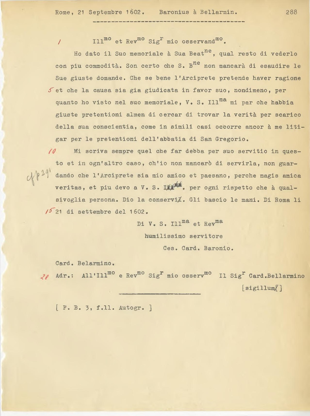 Adr.: All'Ill.mo e Rev.mo Sig.r mio osserv.mo Il Sig.r Card. Bellarmino