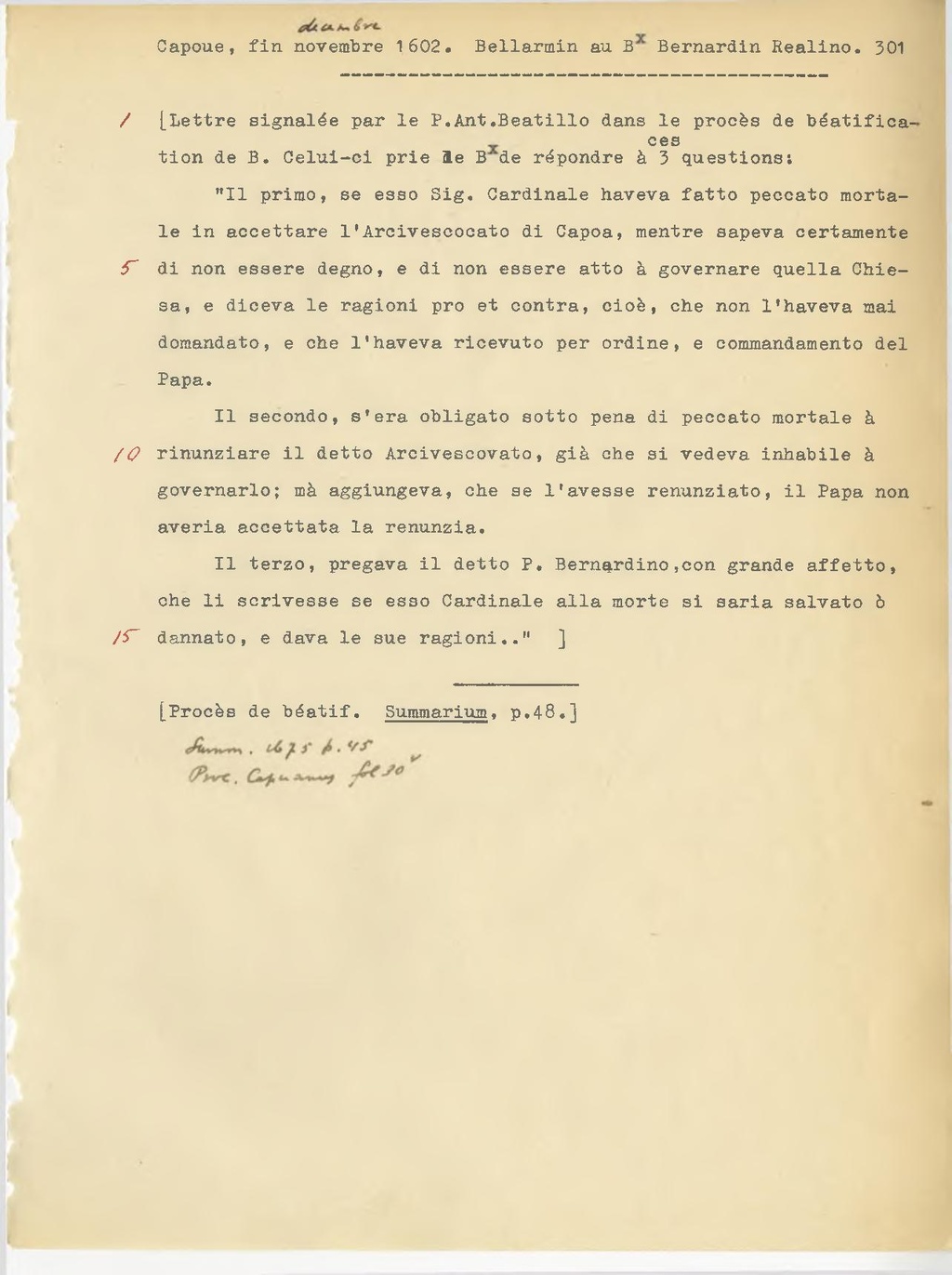 "Il primo, se esso Sig. Cardinale aveva fatto peccato mortale in accettare l'Arcivescovato di Capua, mentre sapeva certamente di non essere degno, e di non essere atto a governare quella Chiesa, e diceva le ragioni pro e contra, cioè, che non l'aveva mai domandato, e che l'aveva ricevuto per ordine, e comandamento del Papa.