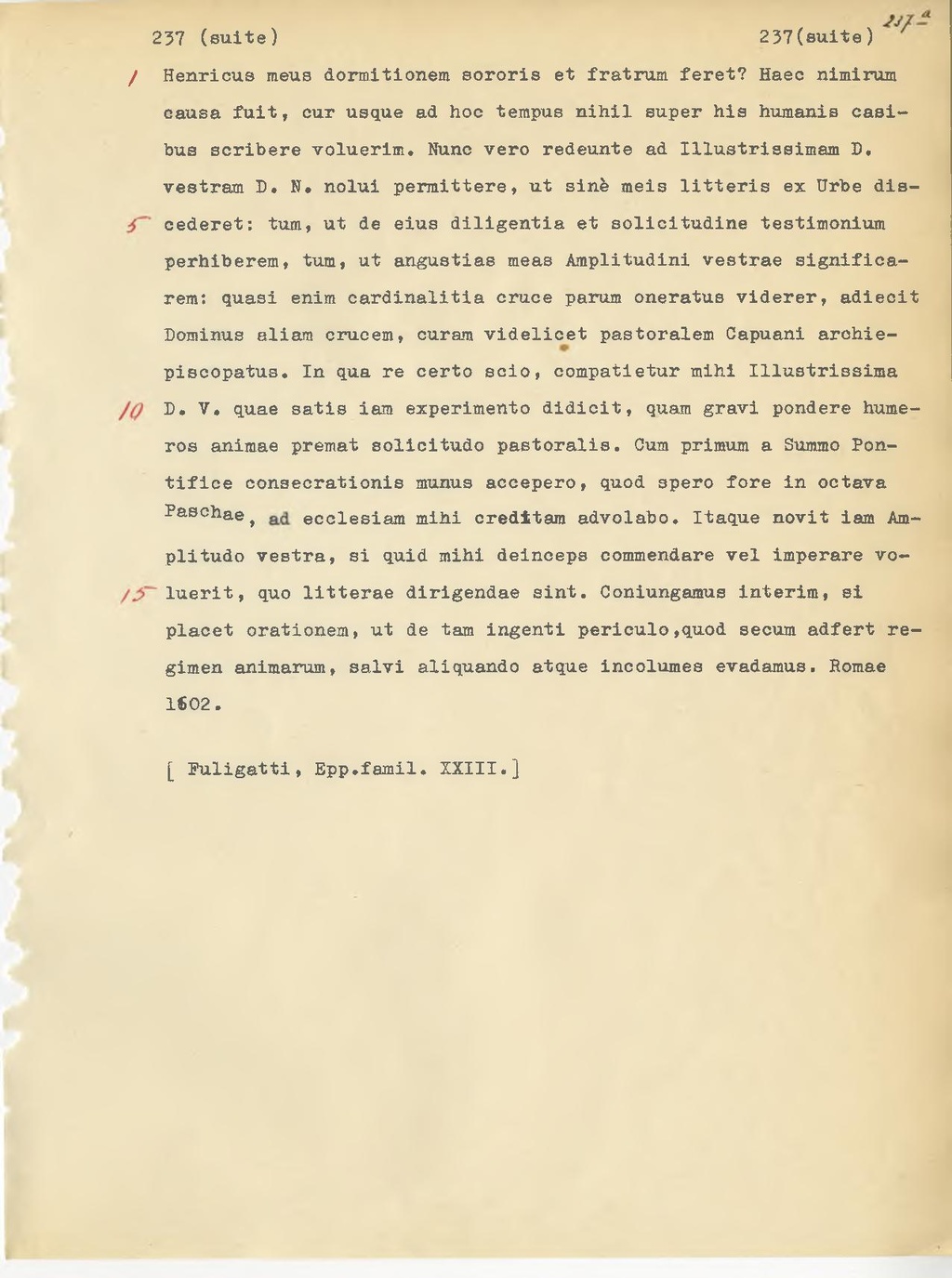 Henricus meus dormitionem sororis et fratrum feret? Haec nimirum causa fuit, cur usque ad hoc tempus nihil super his humanis casibus scribere voluerim. Nunc vero redeunte ad Illustrissimam D. vestram D. N. nolui permittere, ut sine meis litteris ex Urbe discederet: tum, ut de eius diligentia et solicitudine testimonium perhiberem, tum, ut angustias meas Amplitudini vestrae significarem: quasi enim cardinalitia cruce parum oneratus viderer, adiecit Dominus aliam crucem, curam videlicet pastoralem Capuani archiepiscopatus. In qua re certo scio, compatietur mihi Illustrissima D.V. quae satis iam experimento didicit, quam gravi pondero humeros animae premat solicitudo pastoralis. Cum primum a Summo Pontifica consecrationis munus accepero, quod spero fora in octava Faschae^ ecclesiam mihi creditam advolabo. Itaque novit iam Amplitudo vostra, si quid mihi deinceps commendare voi imperare voluerit, quo litterae dirigendae sint. Coniungamus interim, si placet orationem, ut de tam ingenti periculo,quod secum adfert regimen animarum, salvi aliquando atque incolumes evadamus. Romae 1602.