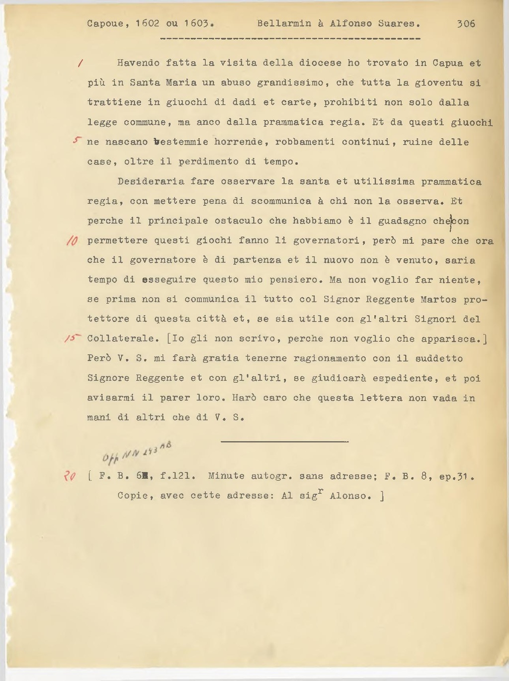 Avendo fatta la visita della discese ho trovato in Capua e più in Santa Maria un abuso grandissimo, che tutta la gioventù si trattiene in giochi[1] di dadi et carte, proibiti non solo dalla legge comune, ma anche dalla prammatica regia. E da questi giochi ne nascono bestemmie orrende, rubamenti continui, rovine delle case, oltre la perdita di tempo. Desidererei fare osservare la santa e utilissima prammatica regia, con mettere pena di scomunica a chi non la osserva. E perchè il principale ostacolo che abbiamo è il guadagno che con permettere questi giochi fanno li governatori, però mi pare che ora che il governatore è di partenza e il nuovo non è venuto, sarebbe tempo di eseguire questo mio pensiero. Ma non voglio far niente, se prima non si comunica il tutto col Signor Reggente Martos protettore di questa città e, se sia utile con gli altri Signori del Collaterale. [lo gli non scrivo, perchè non voglio che apparisca.] Però V.S. mi farà grazia tenerne ragionamento con il suddetto Signore Reggente et con gli altri, se giudicherà espediente, e poi svisarmi il parer loro. Avrò caro che questa lettera non vada in mani di altri che di V.S.