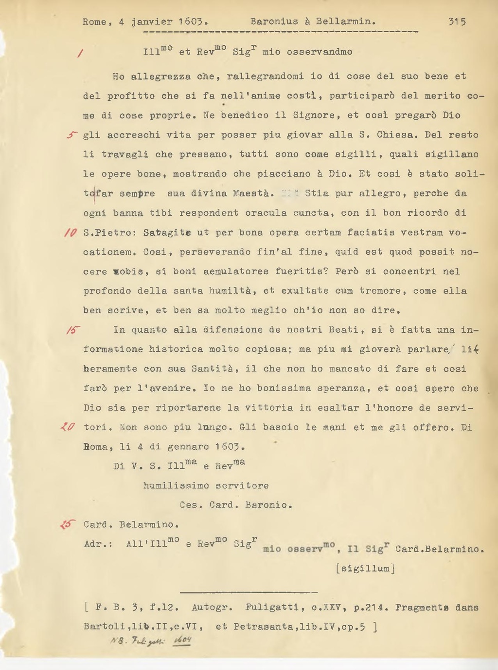 In quanto alla difensione de nostri Beati, si è fatta una informazione storica molto copiosa; ma più mi gioverà parlare liberamente con sua Santità, il che non ho mancato di fare e così farò per 1'avvenire. Io ne ho buonissima speranza, e così spero che Dio sia per riportarene la vittoria in esaltar l'onore dei servitori. Non sono più lungo. Gli bacio le mani e me gli offero. Di Roma, li 4 di gennaro 1603.