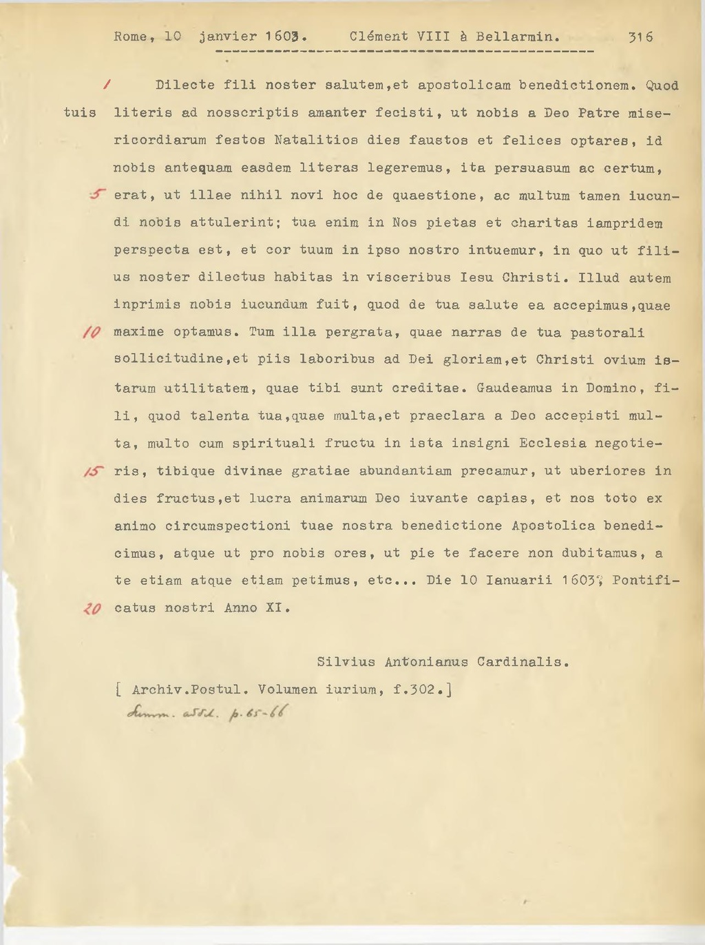 Dilecte fili noster salutem, et apostolicam benedictionem. Quod tuis literis ad nosscriptis amanter fecisti, ut nobis a Beo Patre misericordiarum festos Natalitios dies faustos et felices optares, id nobis antequam easdem literas legeremus, ita persuasum ac certum, erat, ut illae nihil novi hoc de quaestione, ac multum tamen iucundi nobis attulerint; tua enim in Nos pietas et charitas iampridem perspecta est, et cor tuum in ipso nostro intuemur, in quo ut filius noster dilectus habitus in visceribus Iesu Christi. Illud autem inprimis nobis iucundum fuit, quod de tua salute ea accepimus, quae maxime optamus. Tum illa pergrata, quae narras de tua pastorali sollicitudine, et piis laboribus ad Dei gloriam, et Christi ovium istarum utilitatem, quae tibi sunt creditae. Gaudeamus in Domino, fili, quod talenta tua, quae multa, et praeclara a Deo accepisti multa, multo cum spirituali fructu in ista insigni Ecclesia negotieris, tibique divinae gratiae abundantiam precamur, ut uberiores in dies fructus, et lucra animarum Deo iuvante capias, et nos toto ex animo circumspectioni tuae nostra benedictione Apostolica benedicimus, atque ut pro nobis ores, ut pie te tacere non dubitamus, a te etiam atque etiam petimus, etc... Die 10 lanuarii 1603, Pontificatus nostri Anno XI.