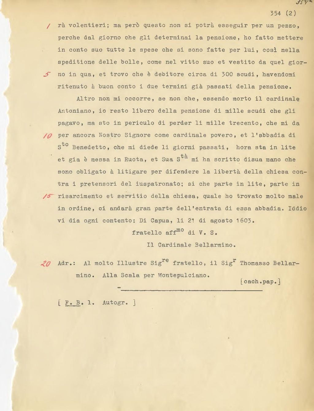 Al molto Illustre Sig.re fratello, il Sig.r Thomasso Bellarmino. Alla Scala per Montepulciano.