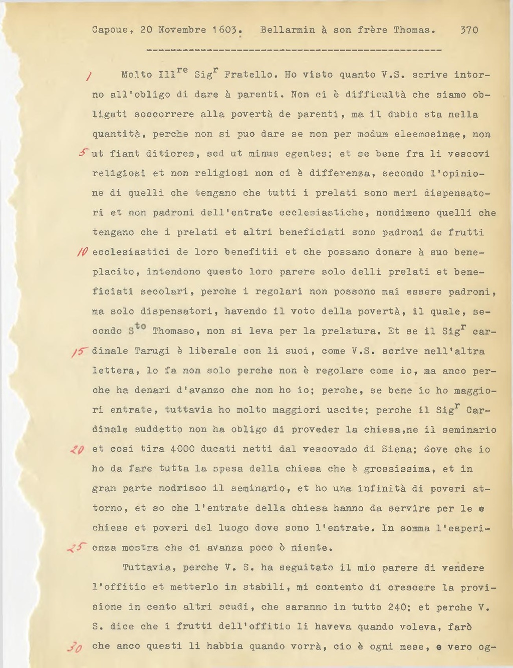 Molto Ill.re Sig.r Fratello. Ho visto quanto V.S. scrive intorno all'obbligo di dare a parenti. Non ci è difficoltà che siamo obbligati soccorrere alla povertà de parenti, ma il dubbio sta nella quantità, perchè non si può dare se non per modum eleemosinae, non ut fiant ditiores, sed ut minus egentes; e se bene fra i vescovi religiosi e non religiosi non ci è differenza, secondo l'opinione di quelli che tengano che tutti i prelati sono meri dispensatori e non padroni dell'entrata ecclesiastiche, nondimeno quelli che tengano che i prelati et altri beneficiati sono padroni de frutti ecclesiastici dei loro benefici e che possano donare a suo beneplacito, intendono questo loro parere solo dei prelati e beneficiati secolari, perchè i regolari non possono mai essere padroni, ma solo dispensatori, avendo il voto della povertà, il quale, secondo S.to Thomaso, non si leva per la prelatura. E se il Sig.r cardinale Tarugi è liberale con li suoi, come V.S. scrive nell'altra