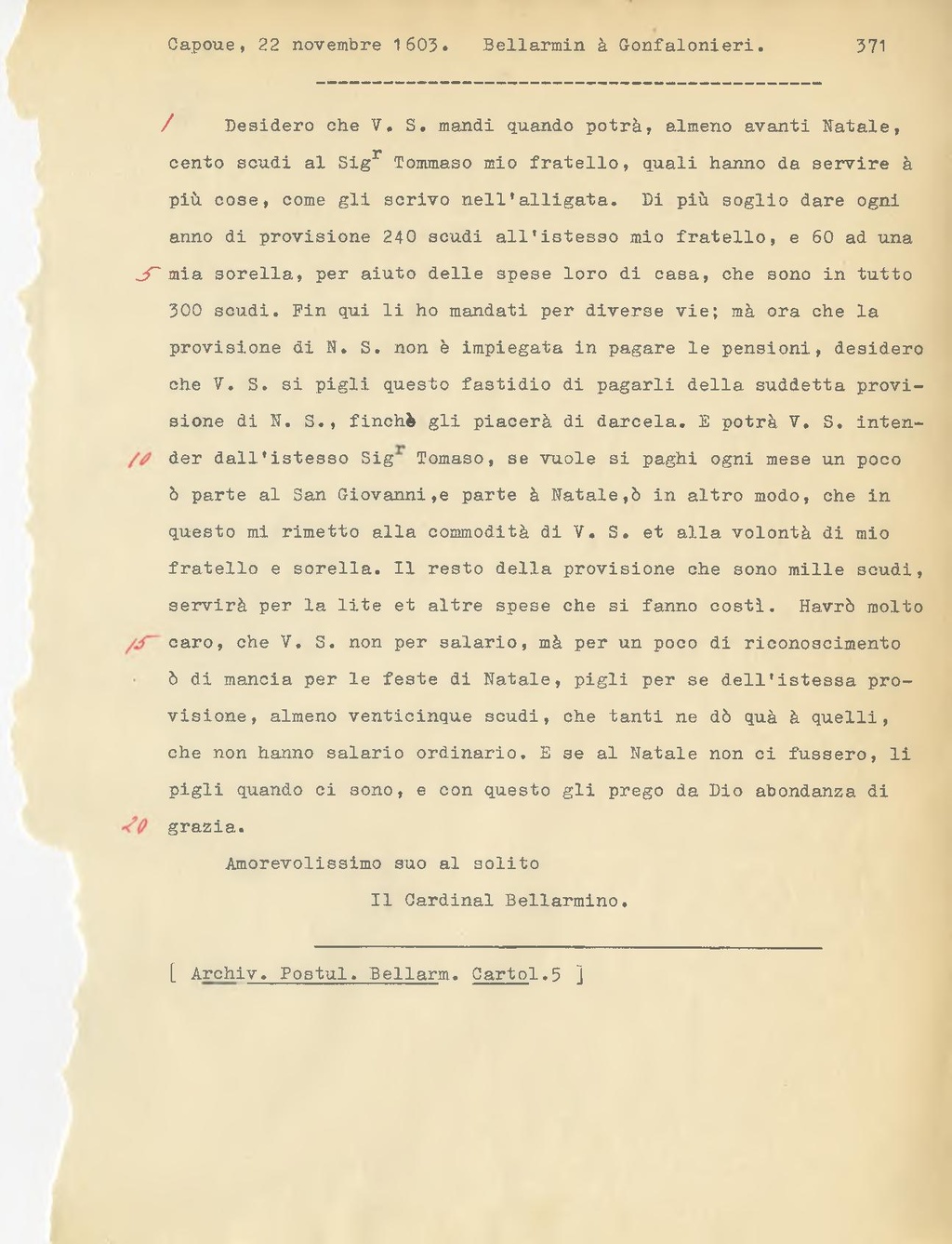 Desidero che V.S. mandi quando potrà, almeno avanti Natale, cento scudi al Sig.r Tommaso mio fratello, quali hanno da servire a più cose, come gli scrivo nell'allegata. Di più soglio dare ogni anno di provvigione 240 scudi all'istesso mio fratello, e 60 ad una mia sorella, per aiuto delle spese loro di casa, che sono in tutto 300 scudi. Fin qui li ho mandati per diverse vie; ma ora che la provvigione di N.S. non è impiegata in pagare le pensioni, desidero che V.S. si pigli questo fastidio di pagarli della suddetta provvigione di N.S., finchè gli piacerà di darcela. E potrà V.S. intender dall'istesso Sig.r Tomaso, se vuole si paghi ogni mese un poco o parte al San Giovanni, e parte a Natale, o in altro modo, che in questo mi rimetto alla comodità di V.S. e alla volontà di mio fratello e sorella. Il resto della provvigione che sono mille scudi, servirà per la lite e altre spese che si fanno costì. Avrà molto caro, che V.S. non per salario, ma per un poco di riconoscimento o di mancia per le feste di Natale, pigli per se dell'istessa provvigione, almeno venticinque scudi, che tanti ne do qua a quelli, che non hanno salario ordinario. E se al Natale non ci fossero, li pigli quando ci sono, e con questo gli prego da Dio abbondanza di grazia.