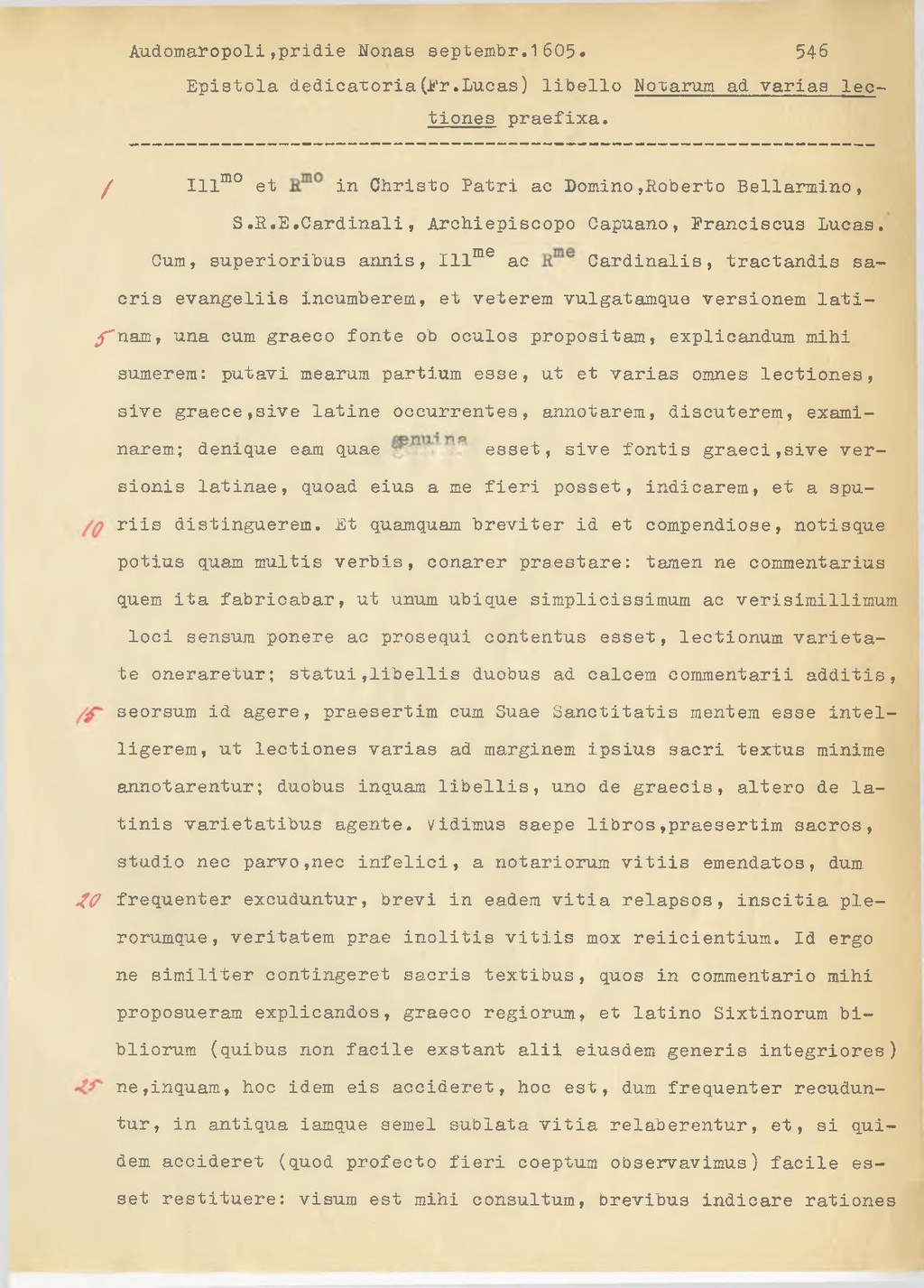 Cum, superioribus annis, Ill.mae ac R.me Cardinalis, tractandis sacris evangeliis incumberem, et veterem vulgatamque versionem latinam, una cum graeco fonte ob oculos propositam, explicandum mihi sumerem: putavi mearum partium esse, ut et varias omnes lectiones, sive grece, sive latine occurrentes, annotarem, discuterem, examinarem; denique eam quae genuina esset, sive fontis graeci,sive versionis latinae, quoad eius a me fieri posset, indicarem, et a spuriis distinguerem. Et quamquam breviter id et compendiose, notisque potius quam multis verbis, conarer praestare: tamen ne commentarius quem ita fabricabar, ut unum ubique simplicissimum ac verisimillimum loci sensum ponere ac prosequi contentus esset, lectionum varietate oneraretur; statui, libellis duobus ad calcem commentarii additis, seorsum id agere, praesertim cum Suae Sanctitatis mentem esse intelligerem, ut lectiones varias ad marginem ipsius sacri textus minime annotarentur; duobus inquam libellis, uno de graecis, altero de latinis varietatibus agente, vidimus saepe libros, praesertim sacros, studio nec parvo,nec infelici, a notariorum vitiis emendatos, dum frequentar excuduntur, brevi in eadem vitia relapsos, inscitia plerorumque, veritatem prae inolitis vitiis mox reiiicientium. Id ergo ne similiter contingeret sacris textibus, quos in commentario mihi proposueram explicandos, graeco regoorum, et latino Sixtinorum bibliorum (quibus non facile exstant alii eiusdem generis integriores) ne, inquam, hoc idem eis accideret, hoc est, dum frequentar recuduntur, in antiqua iamque semel sublata, vitia relaberentur, et, si quidam accideret (quod profecto fieri coeptum observavimus) facile esset restituire: visum est mihi consultum, brevibus indicare rationes