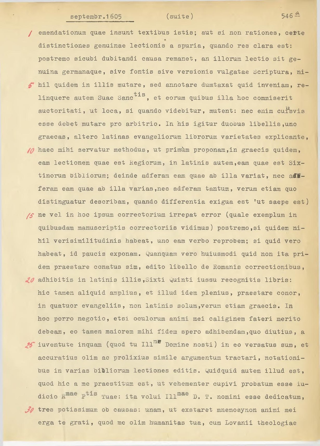 emendationum quae insunt textibus istis; aut si non rationes, certe distinctiones genuinae lectionis a spuria, quando res clara est: postremo sicubi dubitandi causa remanet, an illorum lectio sit genuina germanaque, sive fontis sive versionis vulgatae Scriptura, nihil quidem in illis mutare, sed annotare dumtaxat quid inveniam, relinquere autem Suae Sanc.tis, et eorum quibus illa hoc commiserit auctoritati, ut loca, si quando videbitur, mutent: nec enim cuiusvis esse debet mutare pro arbitrio. In his igitur duobus libellis, uno graecas, altero latinas evangeliorum librorum varietates explicante, haec mihi servatur methodus, ut primum proponam, in graecis quidem, eam lectionem quae est Regiorum, in latinis autem, eam quae est Sixtinorum bibliorum; deinde adferam eam quae ab illa variat, nec aferam eam quae ab illa varias, nec adferam tantum, verum etiam quo distinguatur describam, quando differentia exigua est'ut saepe est ne vel in hoc ipsum correctorium irrepat error (quale exemplum in quibusdam manusciiptis correctoriis vidimus) postremo, si quidem nihil verisimiltudinis habeat, uno eam verbo reprobem; si quid vero habeat, id paucis exponam. Quanquam vero huiusmodi quid non ita pridem praestare conatus sim, edito libello de Romania correctionibus, adhibitis in latinis illis, Sixti Quinti iussu recognitis libris: hic tamen aliquid amplius, et illud idem plenius, praestare conor, in quatuor evangeliis, non latinis solum, verum etiam graecis. In hoc porro negotio, etsi oculorum animi mei caliginem fateri merito debeam, eo tamen maiorem mihi fidem spero adhibendam, quo diutius, a inventate inquam (quod tu Ill.me Domine nosti) in eo versatus sum, et accuratius olim ac prolixius simile argumentum tractari, notationibus in varias bibliorum lectiones editis. Quidquid autem illud est, quod hic a me praestitum est, ut vehementer capivi probatum esse iudicio R.mae P.tis Tuae: ita volui Ill.me D. T. nomini esse dedicatum, tres potissimum ob causas: unam, ut exstaret mnemosynon animi mei erga te grati, quod me olim humanitas tua, cum Lovanii theologiae