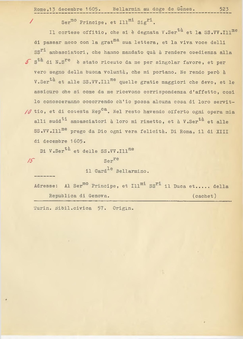 Il cortese officio, che si è degnata V.Ser.tà e la SS.VV. Ill.me di passar con me con la grat.ma sua lettera, e la viva voce degli ambasciatori, che hanno mandato qua a rendere obbedienza alla S.tà di N.S.re è stato ricevuto da me per singolar favore, e per vero segno della buona volontà, che mi portano. Ne rendo però a V.Ser.tà e alle SS.VV. Ill.me quelle grazie maggiori che devo, e le assicuro che siccome da me ricevono corrispondenza d'affetto, così lo conosceranno occorrendo ch'io possa alcuna cosa di loro servizio, e di codesta Rep.ca. Nel resto avendo offerto ogni opera mia ai sudd.ti ambasciatori a loro mi rimetto, e a V.Ser.tà e alle SS.VV. Ill.me prego da Dio ogni vera felicità. Di Roma, il di XIII di dicembre 1605.