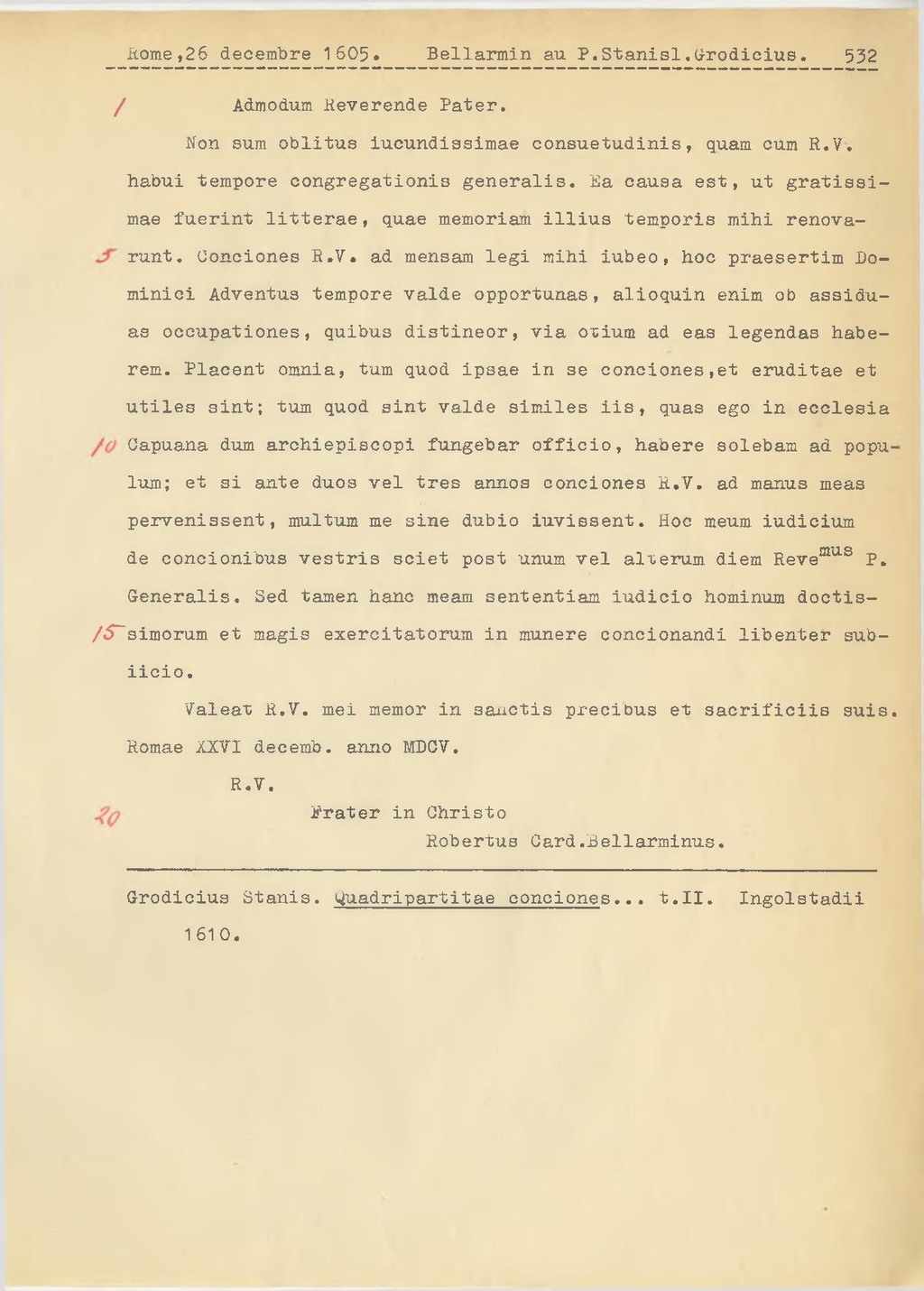 Non sum oblitus iucundissimae consuetudinis, quam cum R.V. habui tempore congregationis generalis. Ea causa est, ut gratissimae fuerint litterae, quae memoriam illius temporis mihi renovarunt. Conciones R.V. ad mensam legi mihi iubeo, hoc praesertim Dominici Adventus tempore valde opportunas, alioquin enim ob assiduas occupationes, quibus distineor, via otium ad eas legendas haberem. Placent omnia, tum quod ipsae in se conoiones, et eruditae et utiles sint; tum quod sint valde similes iis, quas ego in ecclesia Capuana dum archiepiscopi fungebar officio, habere solebam ad populum; et si ante duos vel tres annos conciones R.V. ad manus meas pervenissent, multum me sine dubio iuvissent. Hoc meum iudicium de concionibus vestris sciet post unum vel alterum diem Reve.mus P. Generalis. Sed tamen hanc meam sententiam iudicio hominum doctissimorum et magis exercitatorum in munere concionandi libenter subiicio.