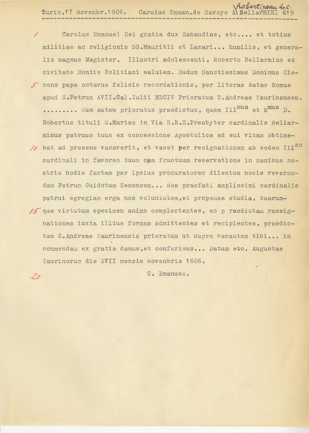 Carolus Emanuel Dei gratia dux Sabaudiae, etc.... et totius militiae ac religionis SS.Mauritii et Lazari... humilis, et generalis magnus Magister, Illustri adolescenti, Roberto Bellarmino ex civitate Montis Politiani salutem. Dudum Sanctissimus Dominus Clemens papa octavus felicis recordationis, per literas datas Romae apud S.Petrum XVII. Cal. Iulii MDCIV Prioratum S.Andreae Taurinensem....Cum autem prioratus praedictus, quem Ill.mua et R.mus D. Robertus tituli S.Mariae in Via S.R.E. Presbyter cardinalis Bellarminus patruus tuus ex concessione Apostolica ad sui vitam obtinebat ad presens vacaverit, et vacet per resignationem ab eodem Ill.mo cardinali in favorem tuum cym fructuum reservatione in manibus nostris hodie factam per ipsius procuratorem dilectum nobis reverendum Petrum Cuidotum Senensem... Nos praefati amplissimi cardinalis patrui egregiam erga nos voluntatem,et propensa studia, tuarumque virtutum specimen animo complectentes, ac p raediutam rassignationem iuxta illius formam admittentes et recipientes, praedictum S.Andreae Taurinensis prioratum ut supra vacantem tibi... in commendam ex gratin damus,et conferimus... Datum etc. Augustae Taurinorum die XVII mensis novenbris 1606.