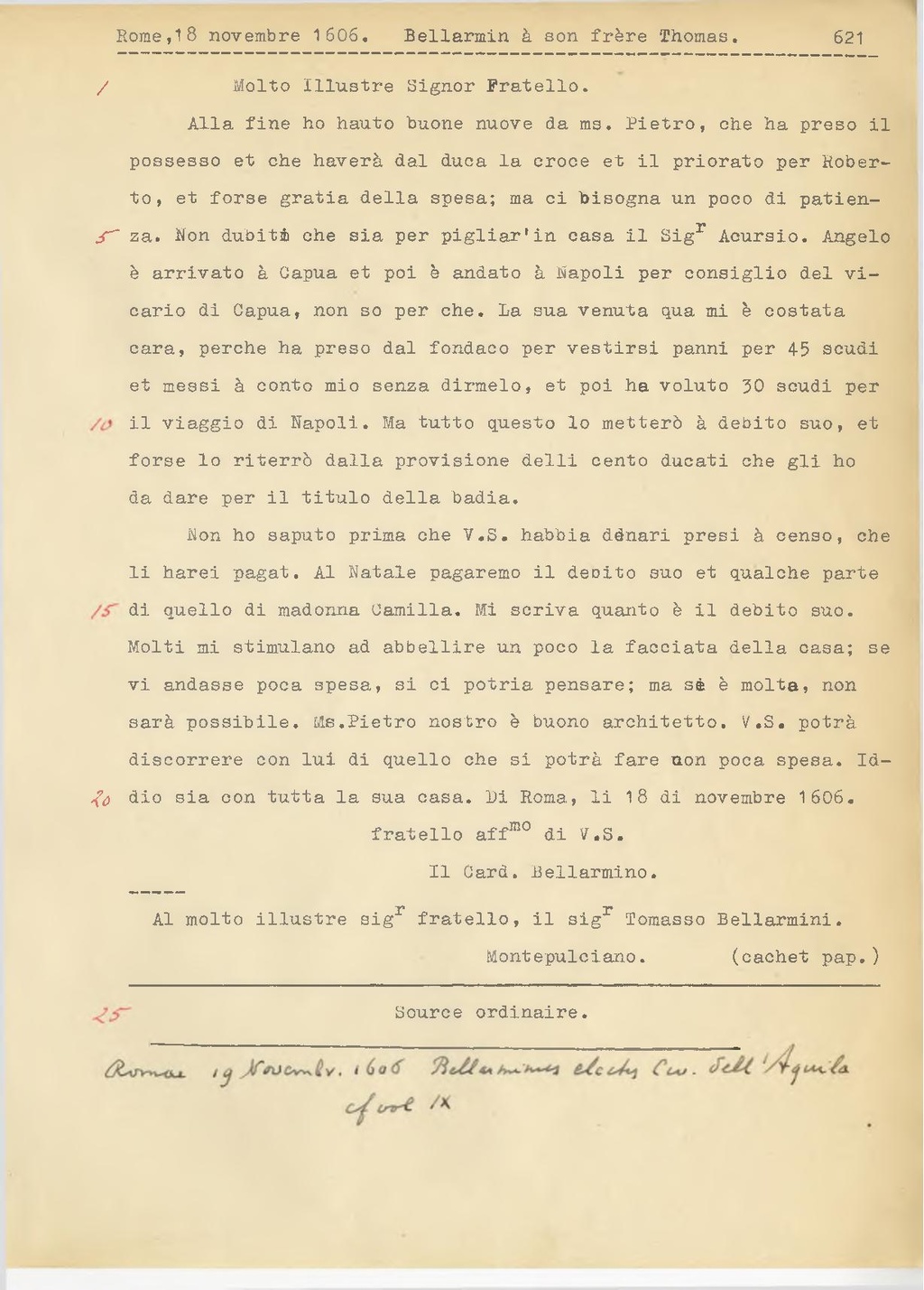 Non ho saputo prima che V.S. abbia denari presi a censo, che li avrei pagat. Al Natale pagheremo il debito suo e qualche parte di quello di madonna Camilla. Mi scriva quanto è il debito suo. Molti mi stimolano ad abbellire un poco la facciata della casa; se vi andasse poca spesa, si ci potrebbe pensare; ma se è molta, non sarà possibile. Ms. Pietro nostro è buono architetto. V.S. potrà discorrere con lui di quello che si potrà fare non poca spesa. Iddio sia con tutta la sua casa. Di Roma, li 18 di novembre 1606.