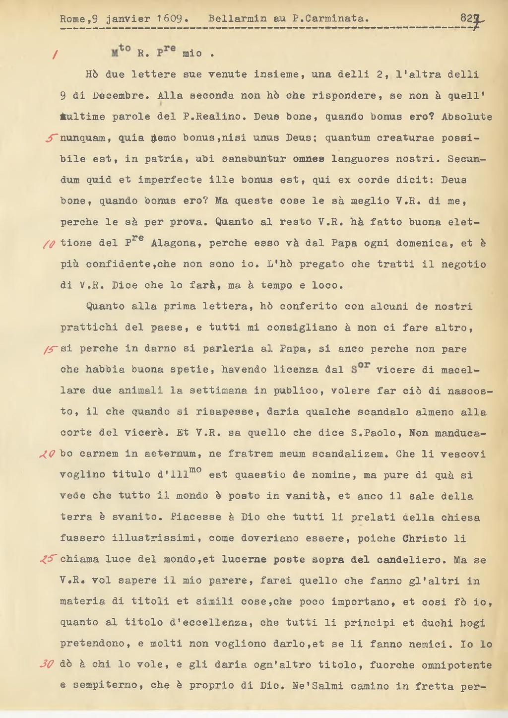 Ho due lettere sue venute insieme, una delli 2, l'altra delli 9 di Decembre. Alla seconda non ho che rispondere, se non a quelle ultime parole del P. Realino. Deus bone, quando bonus ero? Absolute nunquam, quia nemo bonus, nisi unus Deus; quantum creaturae possibile est, in patria, ubi sanabuntur omnes languores nostri. Secundum quid et imperfecte ille bonus est, qui ex corde dicit: Deus bone, quando bonus ero? Ma queste cose le sa meglio V.R. di me, perchè le sa per prova. Quanto al resto V.R. ha fatto buona elezione del P.re Alagona[1], perche esso va dal Papa ogni domenica, e è più confidente che non sono io. L'ho pregato che tratti il negozio di V.R. Dice che lo farà, ma a tempo e loco.