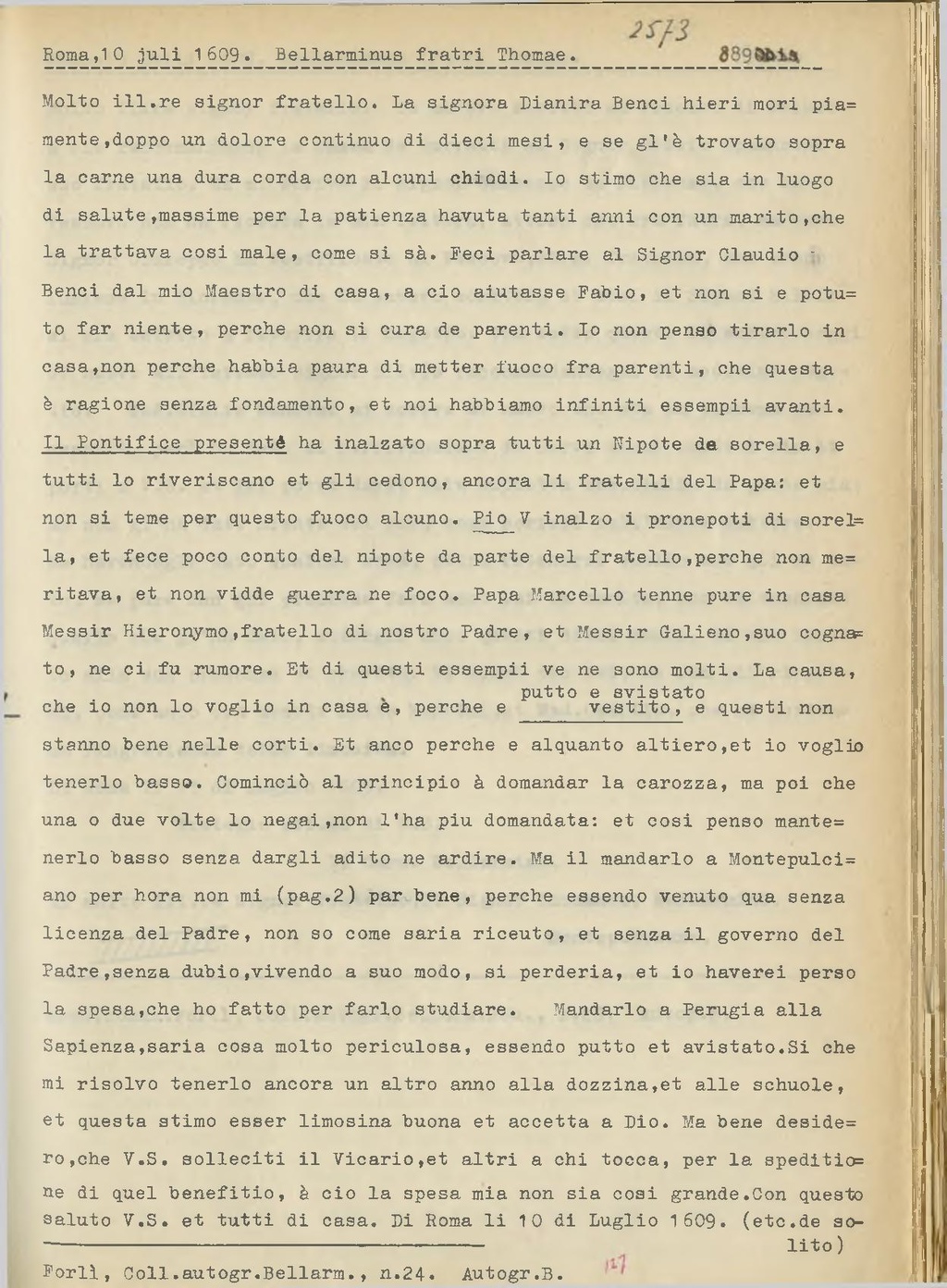 Il Pontifice presente ha inalzato sopra tutti un Nipote da sorella, e tutti lo riveriscano et gli cedono, ancora li fratelli del Papa: et non si teme per questo fuoco alcuno. Pio V inalzo i pronepoti di sorella[1], et fece poco conto del nipote da parte del fratello, perche non meritava, et non vidde guerra ne foco. Papa Marcello tenne pure in casa Messir Hieronymo, fratello di nostro Padre, et Messir Galieno, suo cognato, ne ci fu rumore. Et di questi essempii ve ne sono molti. La causa, che io non lo voglio in casa è, perche e putto svistato, e questi non stanno bene nelle corti. Et anco perche e alquanto altiero, et io voglio tenerlo basso. Cominciò al principio à domandar la carozza, ma poi che una o due volte lo negai, non l'ha piu domandata: et così penso mantenerlo basso senza dargli adito ne ardire. Ma il mandarlo a Montepulciano per hora non mi (pag.2) par bene, perche essendo venuto qua senza licenza del Padre, non so come saria riceuto, et senza il governo del Padre, senza dubbo, vivendo a suo modo, si perderia, et io haverei perso la spesa, che ho fatto per farlo studiare. Mandarlo a Perugia alla Sapienza, saria cosa molto periculosa, essendo putto et svistato. Si che mi risolvo tenerlo ancora un altro anno alla dozzina, et alle schuole, et questa stimo esser limosina buona et accetta a Dio. Ma bene desidero, che V.S. solleciti il Vicario, et altri a chi tocca, per la speditione di quel benefitio, à cio la spesa mia non sia così grande. Con questo saluto V.S. et tutti di casa. Di Roma li 10 di Luglio 1609. (etc. de solito)