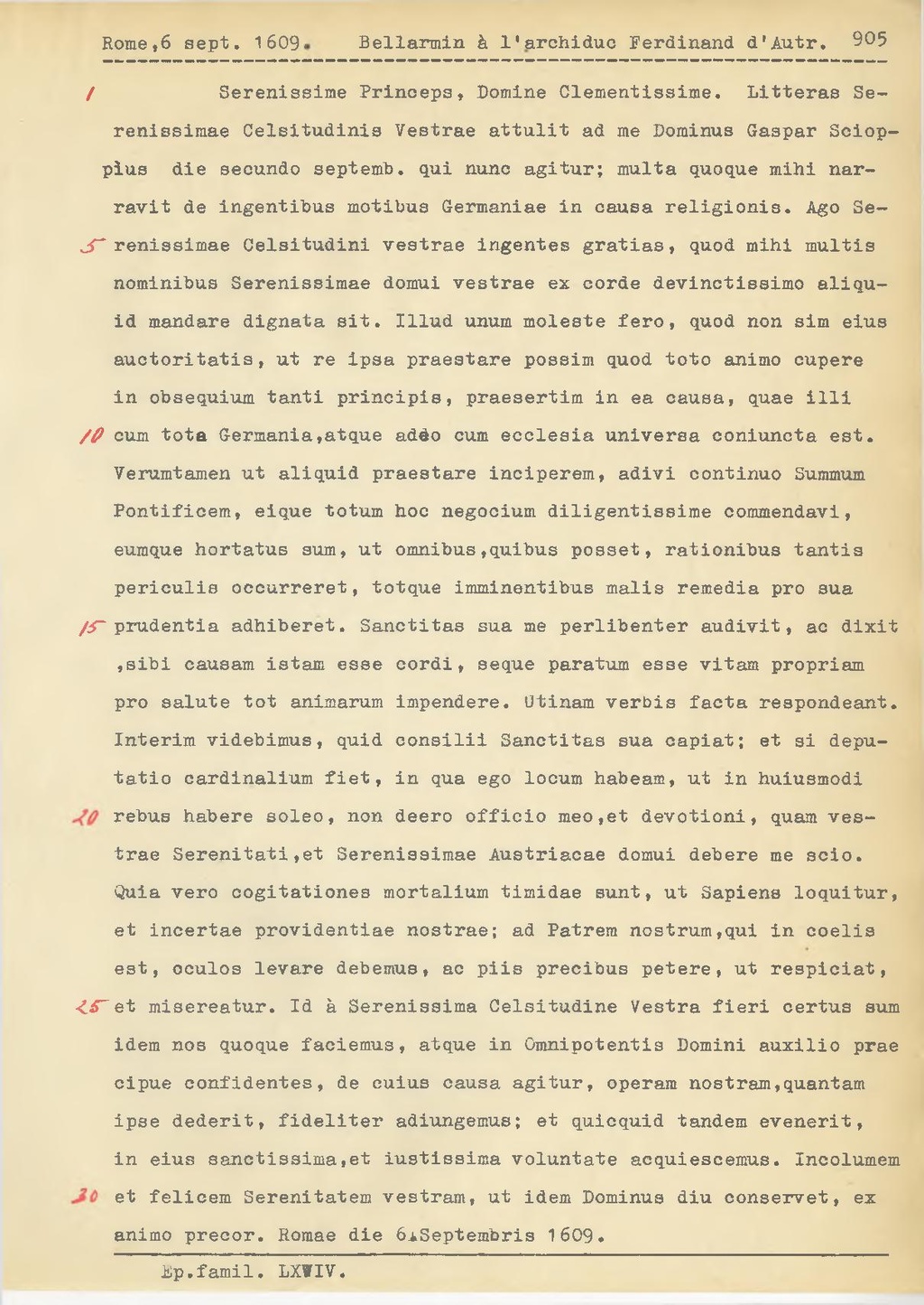 Serenissime Princeps, Domine Clementissime. Litteras Serenissimae Celsitudinis Vestrae attulit ad me Dominus Gaspar Scioppius die secundo septemb. qui nano agitar; multa quoque mihi narravit de ingentibus motibus Germaniae in causa religionis. Ago Serenissimae Celsitudini vestrae ingentes gratias, quod mihi multis nominibus Serenissimae domai vestrae ex corde devinctissimo aliquid mandare dignata sit. Illud unum moleste fero, quod non sim eius auctoritatis, ut re ipsa praestare possim quod tote animo capere in obsequium tanti principis, praesertim in ea causa, quae illi cum tota Germania,atque addo cum ecclesia universa coniuncta est. Verumtamen ut aliquid praestare inciperem, adivi continuo Summum Pontificem, eique totum hoc negocium diligentissime commendavi, eumque hortatus sum, ut omnlbus,quibus posset, rationibus tantis periculis occurreret, totque imminentibus malia remedia pro sua prudentia adhiberet. Sanctitas sua me perlibenter audivit, ac dixit ,sibi causam istam esse cordi, seque paratum esse vitam propriam pro salute tot animarum impendere. Utinam verbis facta respondeant. Interim videbimus, quid consilii Sanctitas sua capiat; et si deputatio cardinalium fiet, in qua ego locum habeam, ut in huiusmodi rebus habere soleo, non deero officio meo,et devotioni, quam ves trae Serenitati, et Serenissimae Austriacae domai debere me scio. Quia vero cogitationes mortalium timidae sunt, ut Sapiens loquitur, et incertae providentiae nostrae; ad Patrem nostrum,qui in coelis est, oculos levare debemus, ac piis precibus petere, ut respiciat, et misereatur. Id a Serenissima Celsitudine Vestra fieri certus sum idem nos quoque faciemus, atque in Omnipotentis Domini auxilio prae cipue confidentes, de cuius causa agitar, operam nostram, quantam ipse dederit, fideliter adiungemus; et quicquid tandem evenerit, in eius sanctissima, et iustissima voluntate acquiescemus. ineolumem et felicem Serenitatem vestram, ut idem Dominus dia conservet, ex animo precor. Romae die 6 Septembris 1609.