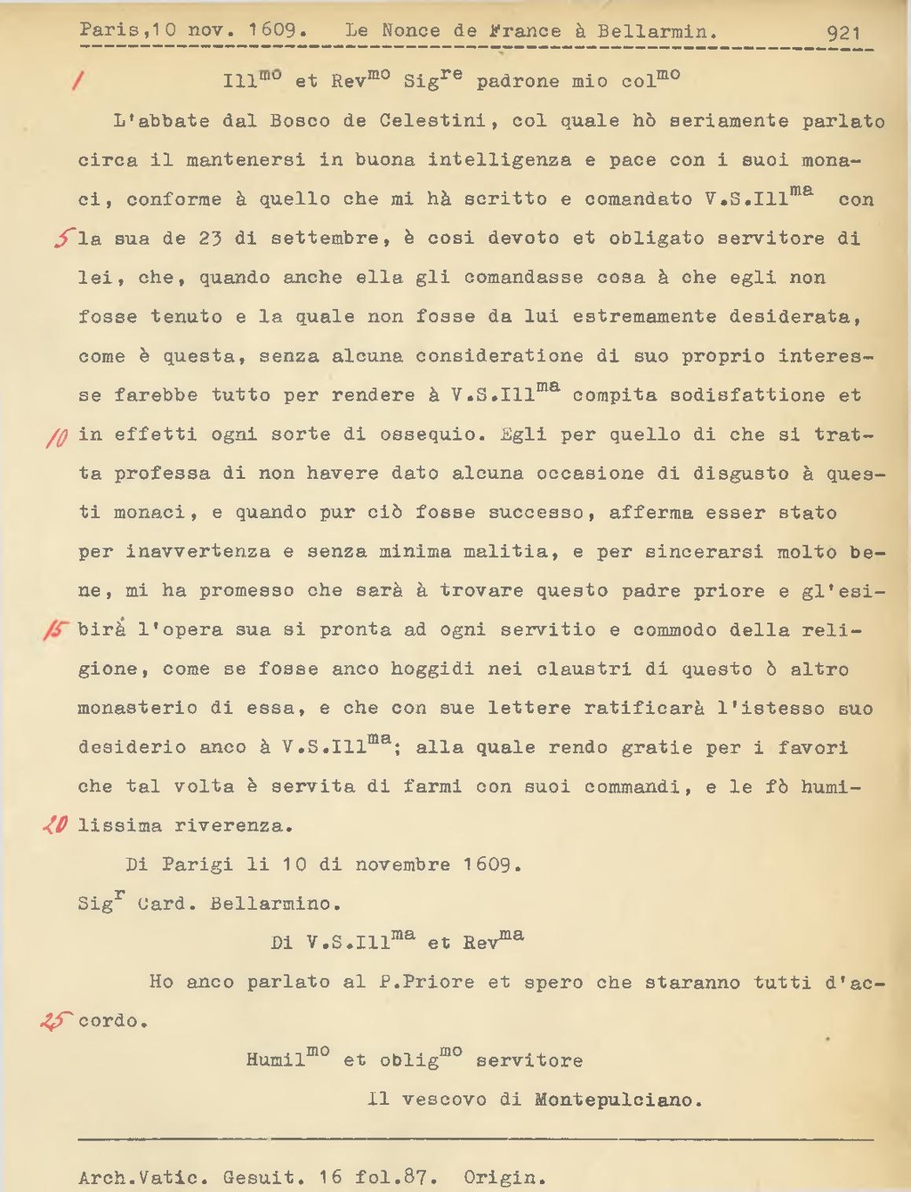 L'abate dal Bosco de Celestini, col quale ho seriamente parlato circa il mantenersi in buona intelligenza e pace con i suoi monaci, conforme a quello che mi ha scritto e comandato V.S. Ill.ma con la sua de 23 di settembre, è così devoto e obbligato servitore di lei, che, quando anche ella gli comandasse cosa a che egli non fosse tenuto e la quale non fosse da lui estremamente desiderata, come è questa, senza alcuna considerazione di suo proprio interesse farebbe tutto per rendere a V.S. Ill.ma compita soddisfazione e in effetti ogni sorte di ossequio. Egli per quello di che si tratta professa di non avere dato alcuna occasione di disgusto a questi monaci, e quando pur ciò fosse successo, afferma esser stato per inavvertenza e senza minima malizia, e per sincerarsi molto bene, mi ha promesso che sarà a trovare questo padre priore e gli esibirà l'opera sua si pronta ad ogni servizio e comodo della religione, come se fosse anche oggi di nei claustri di questo o altro monastero di essa, e che con sue lettere ratificherà l'istesso suo desiderio anche a V.S. Ill.ma alla quale rendo grazie per i favori che tal volta è servita di farmi con suoi comandi, e le faccio umilissima riverenza.
