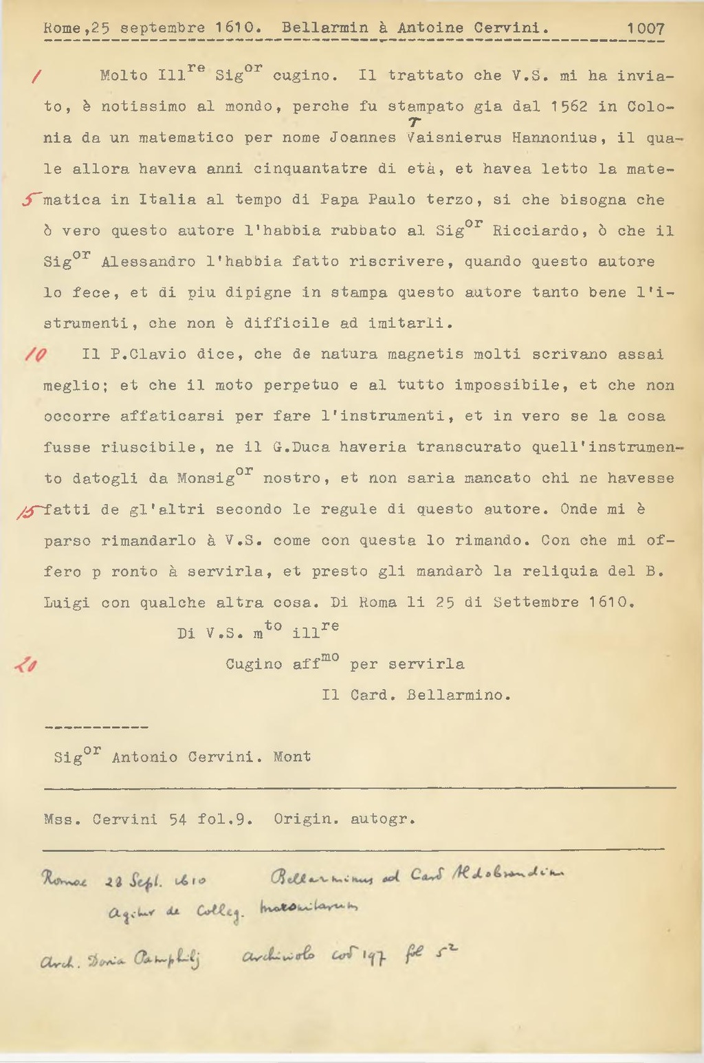 Il P. Clavio dice, che de natura magnetis molti scrivano assai meglio; et che il moto perpetuo e al tutto impossibile, et che non occorre affaticarsi per fare l'instrumenti, et in vero se la cosa fusse riuscibile, ne il G.Duca haveria transcurato quell'instrumento datogli da Monsig.or nostro, et non saria mancato chi ne havesse fatti de gl'altri secondo le regule di questo autore. Onde mi è parso rimandarlo a V.S. come con questa lo rimando. Con ohe mi offero pronto a servirla, et presto gli mandarò la reliquia del B. Luigi con qualche altra cosa. Di Roma li 25 di Settembre 1610.