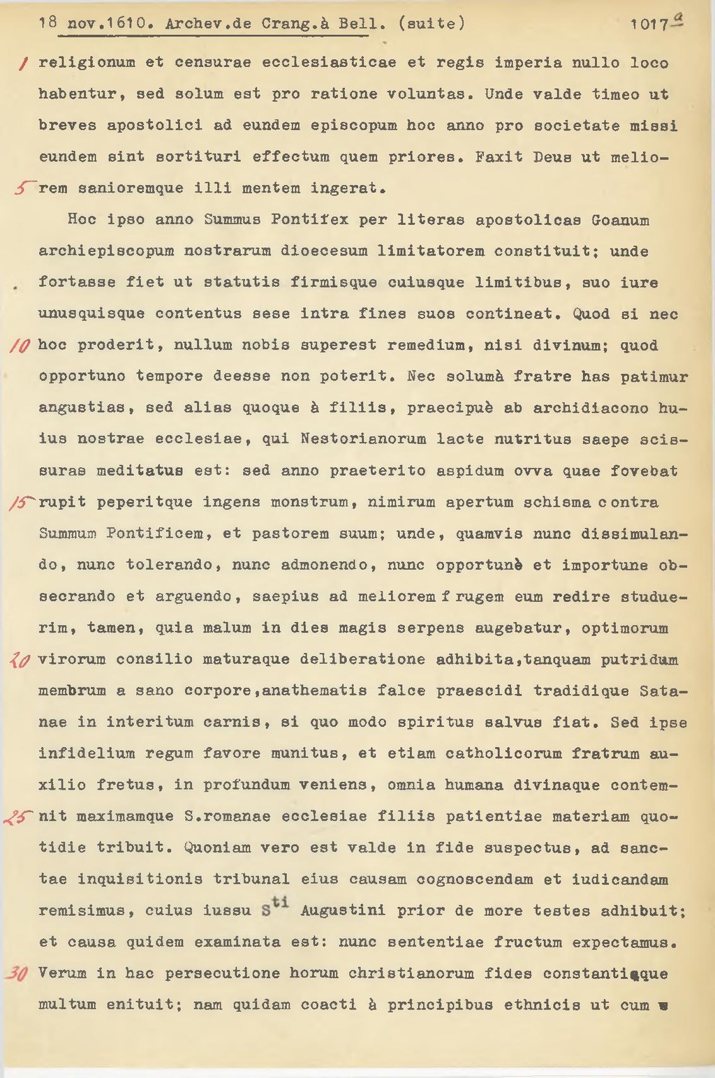 rupit peperitque ingens monstrum, nimirum apertum schisma contra Summum Pontifioem, et pastorem suum; unde, quamvis nunc dissimulando, nunc tolerando, nunc admonendo, nunc opportuni et importune obsecrando et arguendo, saepius ad melioremfrugem eum redire studuerim, tamen, quia malum in dies magis serpens augebatur, optimorum virorum consilio maturaque deliberatione adhibita,tanquam putridum membrum a sano corpore,anathematis falce praescidi tradidique Satanae in interitum carnis, si quo modo spiritus salvus fiat. Sed ipse infidelium regum favore munitus, et etiam catholicorum fratrum auxilio fretus, in profundum veniens, omnia humana divinaque contemnit maximamque S.romanae ecclesiae filiis patientiae materiam quotidie tribuit. Quondam vero est valde in fide suspectus, ad sanctae inquisitionis tribunal eius causam cognoscendam et iudicandam remisimus, cuius iussu S.ti Augustini prior de more testes adhibuit; et causa quidem examinata est: nunc sententiae fructum expectamus.