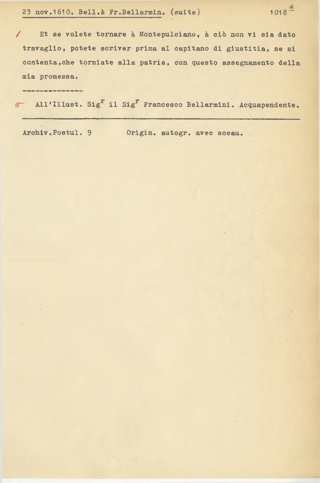 All'Illust. Sig.r il Sig.r Francesco Bellarmini. Acquapendente.