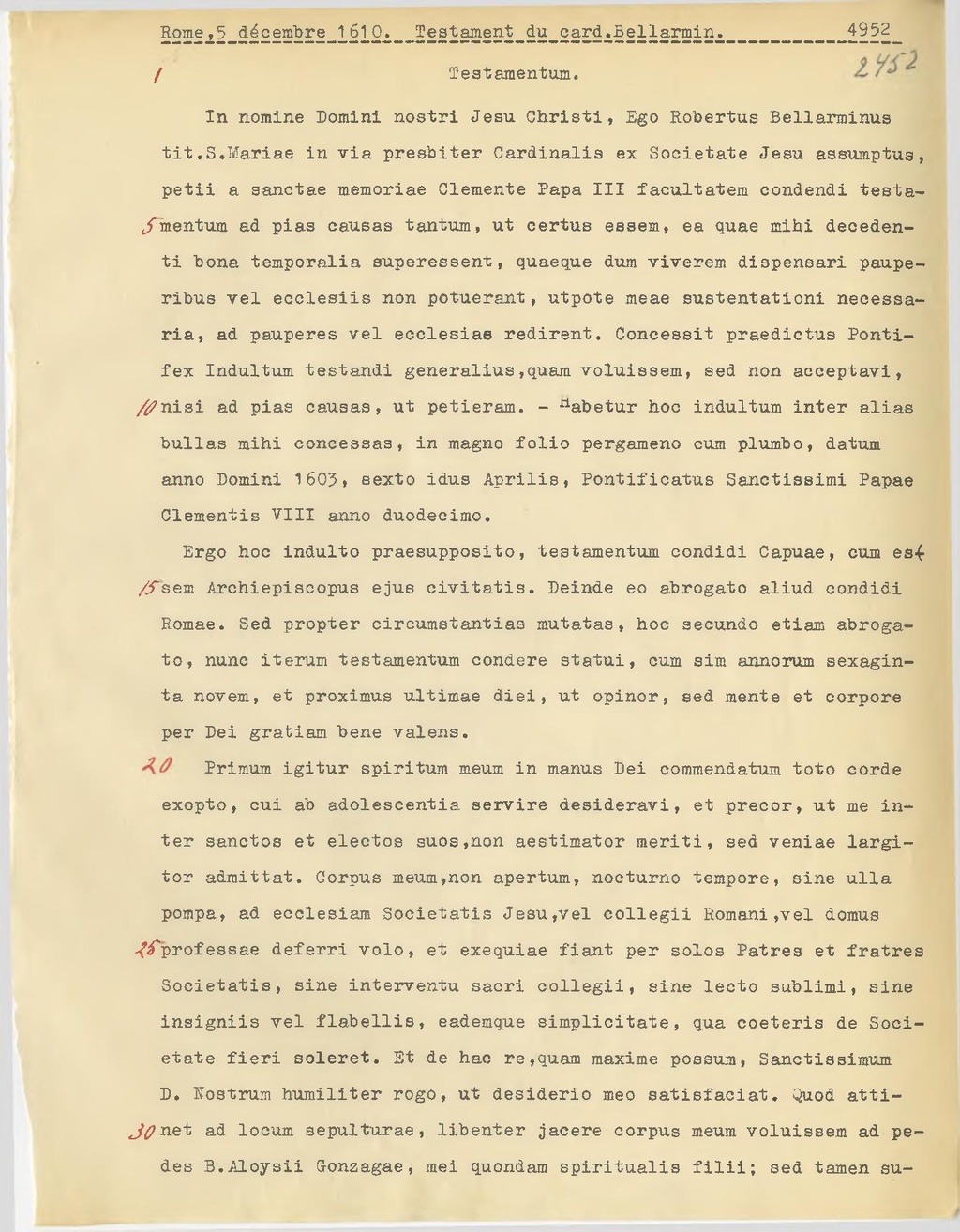 In nomine Domini nostri Jesu Christi, Ego Robertus Bellarminus tit.S. Mariae in via presbiter Cardinalis ex Societate Jesu assumptus, petii a sanctae memorine Clemente Papa III facultatem condendi testamentum ad pias causas tantum, ut certus essem, ea quae mihi decedenti bona temporalia superessent, quaeque dum viverem dispensari pauperibus vel ecclesiis non potuerant, utpote meaa sustentationi necessaria, ad pauperes vel ecclesiae redirent. Concessit praedictus Pontifex Indultum testandi generalius, quam voluissem, sed non acceptavi, nisi ad pias causas, ut petieram. - Habetur hoc indultum inter alias bullas mihi concessas, in magno folio pergameno cum plumbo, datum anno Domini 1603, sexto idus Aprilis, Pontificatus Sanctissimi Papae Clementis VIII anno duodecimo.