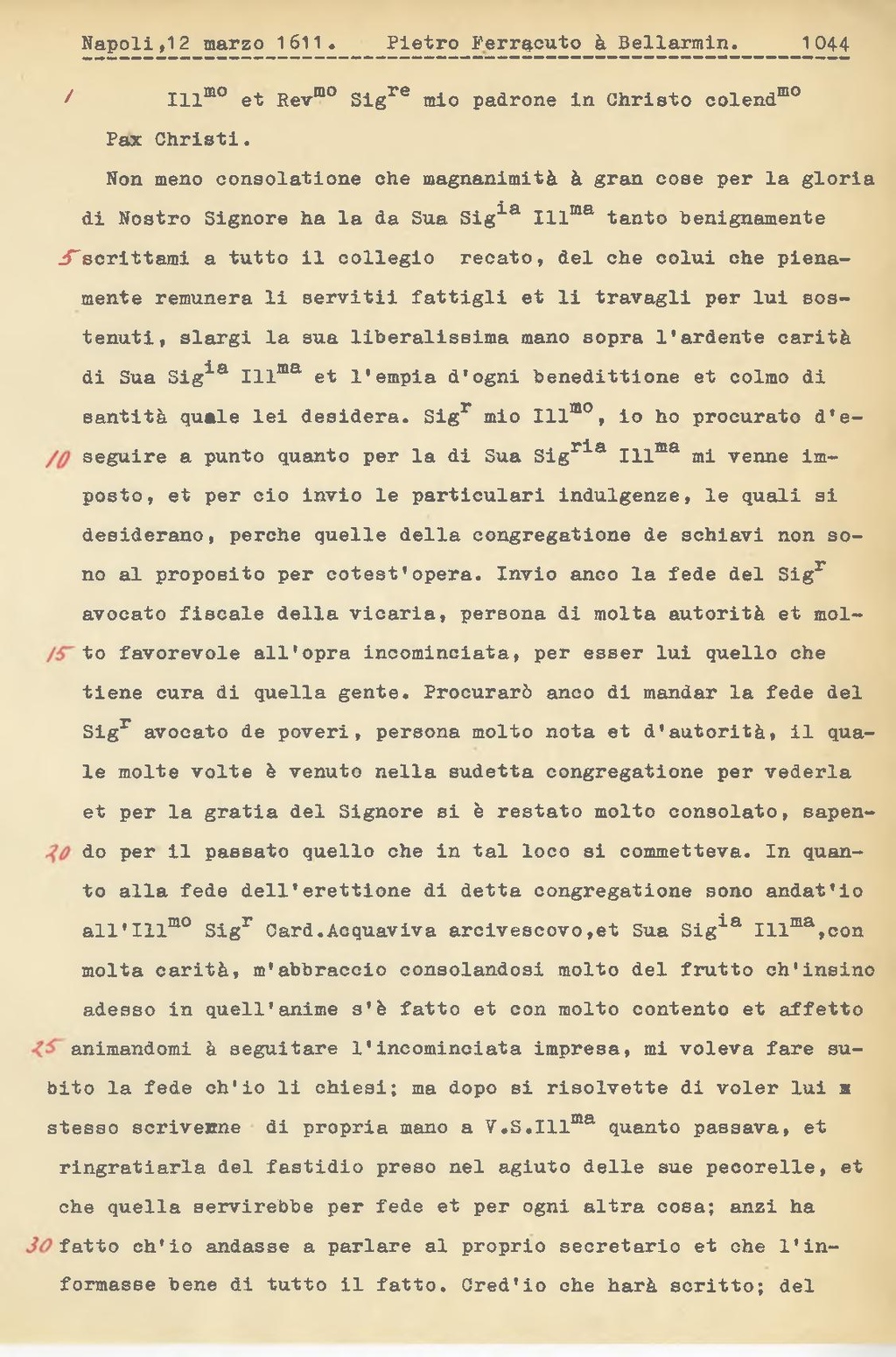 Non meno consolatione che magnanimità a gran cose per la gloria di Nostro Signore ha la da Sua Sig.ia Ill.ma tanto benignamente scrittami a tutto il collegio recato, del che colui che pienamente remunera li servitii fattigli et li travagli per lui sostenuti, slargi la sua liberalissima mano sopra l'ardente carità di Sua Sig.ia Illma et l'empia d'ogni benedittione et colmo di santità quale lei desidera. Sig.r mio Ill.mo, io ho procurato d'eseguire a punto quanto per la di Sua Sig.ria Ill.ma mi venne imposto, et per ciò invio le particulari indulgenze, le quali si desiderano, perchè quelle della congregatione de schiavi non sono al proposito per cotest'opera. Invio anco la fede del Sig.r avocato fiscale della vicaria, persona di molta autorità et molto favorevole all'opra incominciata, per esser lui quello che tiene cura di quella gente. Procurerò anco di mandar la fede del Sig.r avocato de poveri, persona molto nota et d'autorità, il quale molte volte è venuto nella sudetta congregatione per vederla et per la gratia del Signore si è restato molto consolato, sapendo per il passato quello che in tal loco si commetteva. In quanto alla fede dell'erettione di detta congregatione sono andat'io all'Ill.mo Sig.r Card. Acquaviva arcivescovo, et Sua Sig.ia Ill.ma, con molta carità, m'abbraccio consolandosi molto del frutto ch'insino adesso in quell'anime s'è fatto et con molto contento et affetto animandomi a seguitare l'incominciata impresa, mi voleva fare subito la fede ch'io li chiesi; ma dopo si risolvette di voler lui m stesso scriverne di propria mano a V.S. Ill.ma quanto passava, et ringratiarla del fastidio preso nel agiuto delle sue pecorelle, et che quella servirebbe per fede et per ogni altra cosa; anzi ha fatto ch'io andasse a parlare al proprio secretario et che l'in formasse bene di tutto il fatto. Cred'io che harà scritto; del